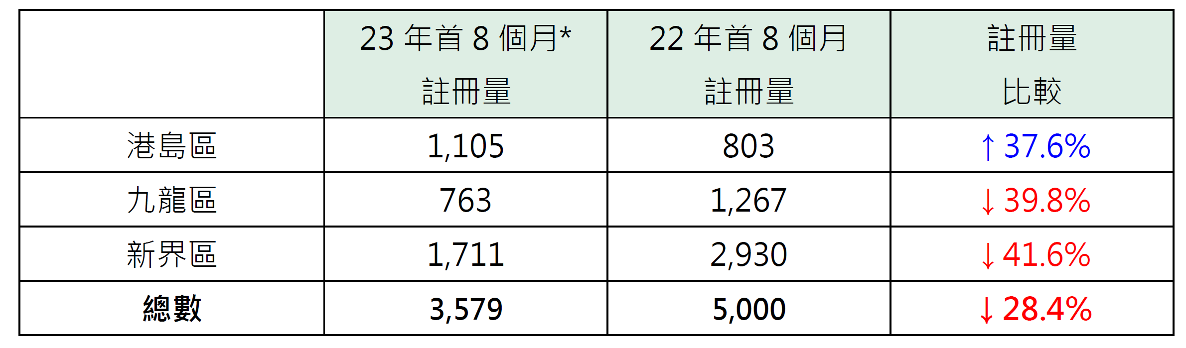 表:以三區劃分今年首8個月*純車位註冊量