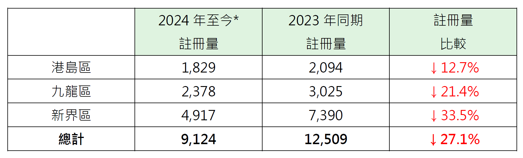 以港島、九龍及新界三區劃分本年至今逾500萬至1,000萬元二手住宅註冊量表現,其中港島區錄1,829宗註冊,較去年同期的2,094宗減少約12.7%;九龍區錄2,378宗註冊,較去年同期的3,025宗減少約21.4%;新界區錄4,917宗註冊,較去年同期的7,390宗減少約33.5%(見表)。