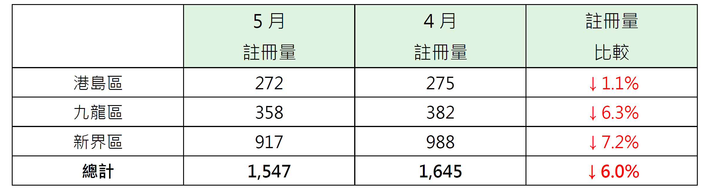 若以港島、九龍及新界三區劃分5月逾500萬至1,000萬元二手住宅註冊量表現,其中港島區錄272宗註冊,較4月的275宗減少約1.1%;九龍區錄358宗註冊,較4月的382宗減少約6.3%;新界區錄917宗註冊,較4月的988宗減少約7.2%。
