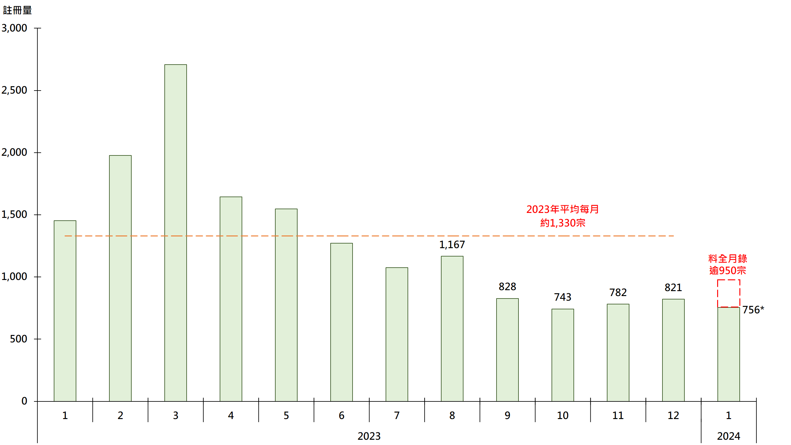 據土地註冊處最新資料顯示,本月至今(截至24日)逾500萬至1,000萬元二手住宅錄756宗註冊,較上月同期的702宗增加約7.7%;按照目前註冊進度推算,料全月錄逾950宗註冊,屆時將創5個月新高,惟仍較去年平均每月約1,330宗為低(見圖)。鑑於簽署買賣合約至遞交到土地註冊處註冊登記需時,2024年1月註冊個案一般主要反映2023年12月市況。