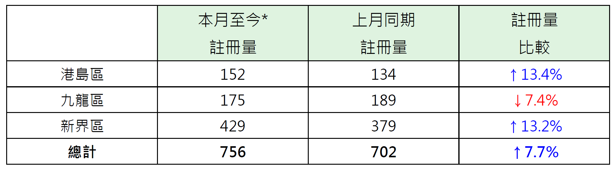 鑑於簽署買賣合約至遞交到土地註冊處註冊登記需時,每月註冊個案一般主要反映前一個月市況