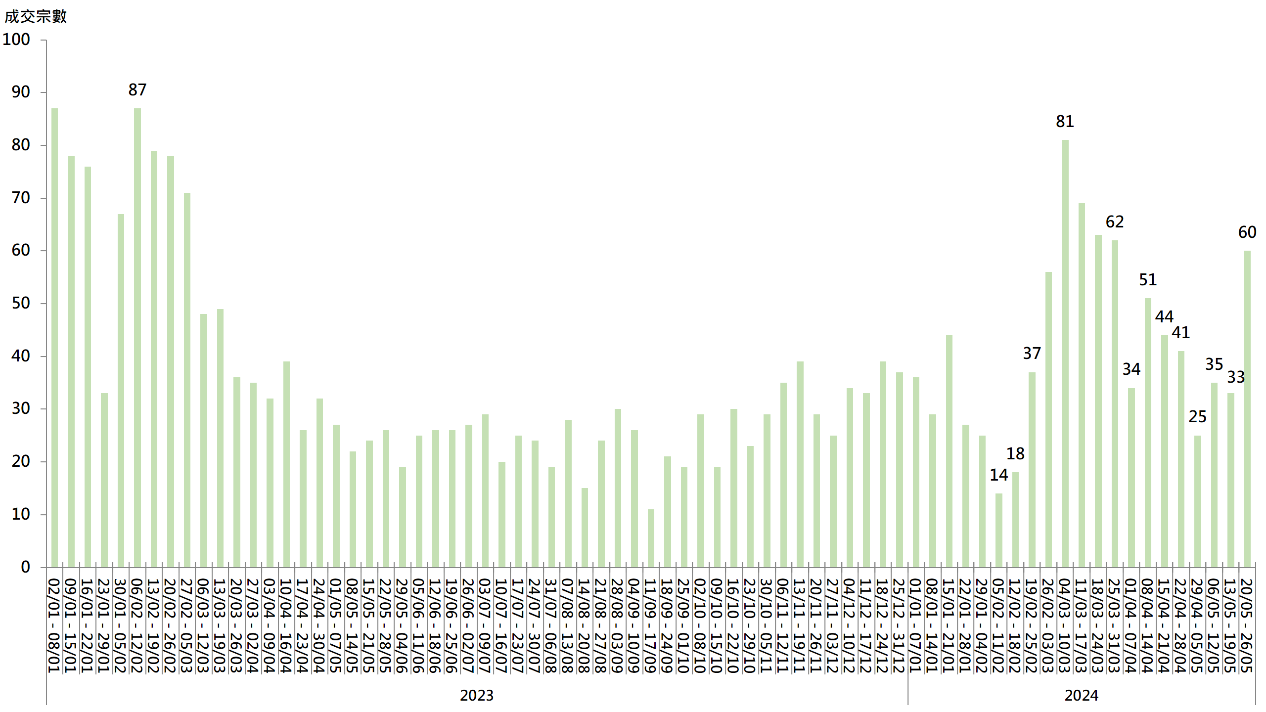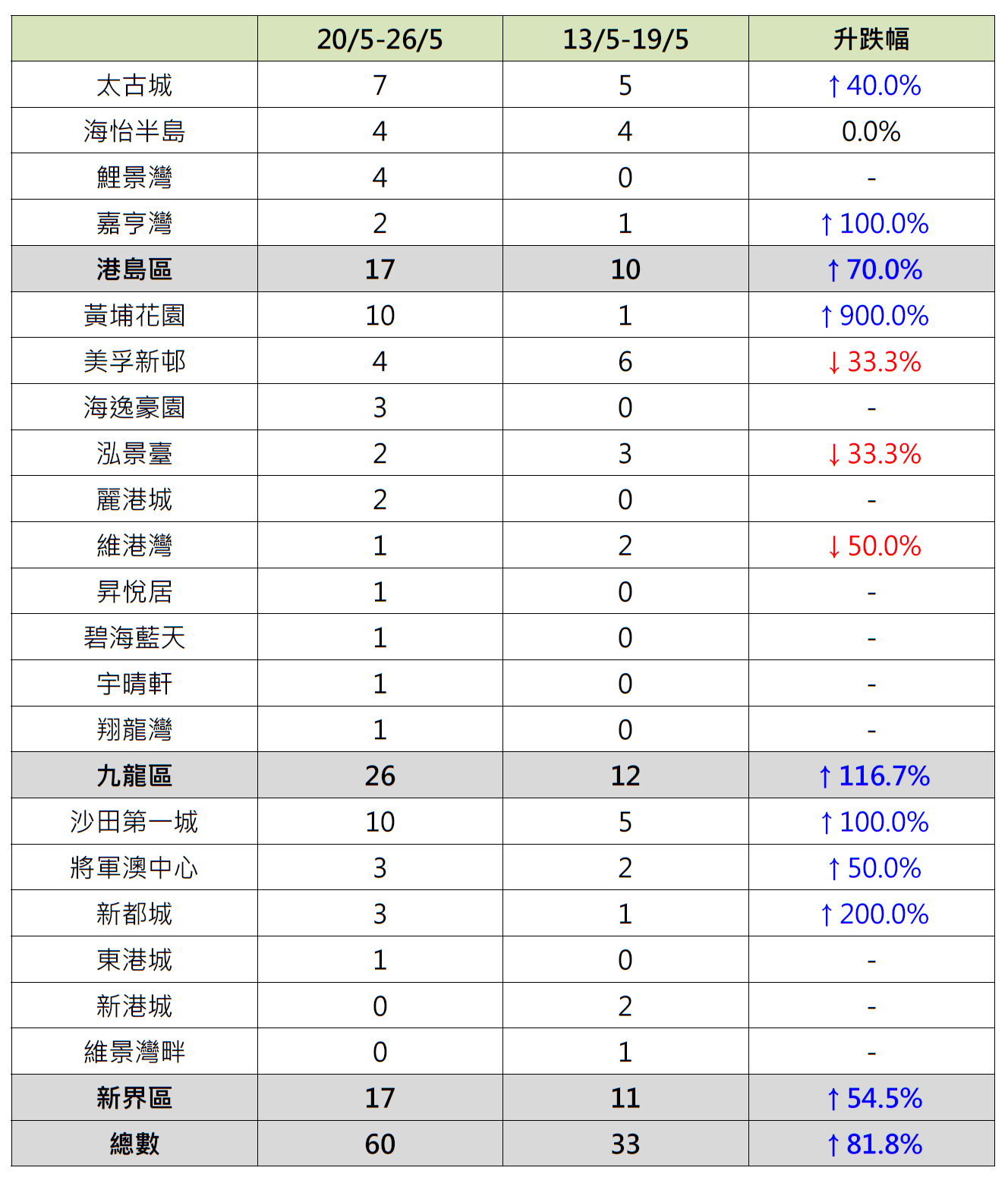 據本行前線分行所錄得的數字顯示,綜合過去一星期(5月20日至5月26日)全港20大主要屋苑二手買賣錄60宗成交,較前周(5月13日至5月19日)的33宗增加約81.8%,並創近8星期新高(見圖)。