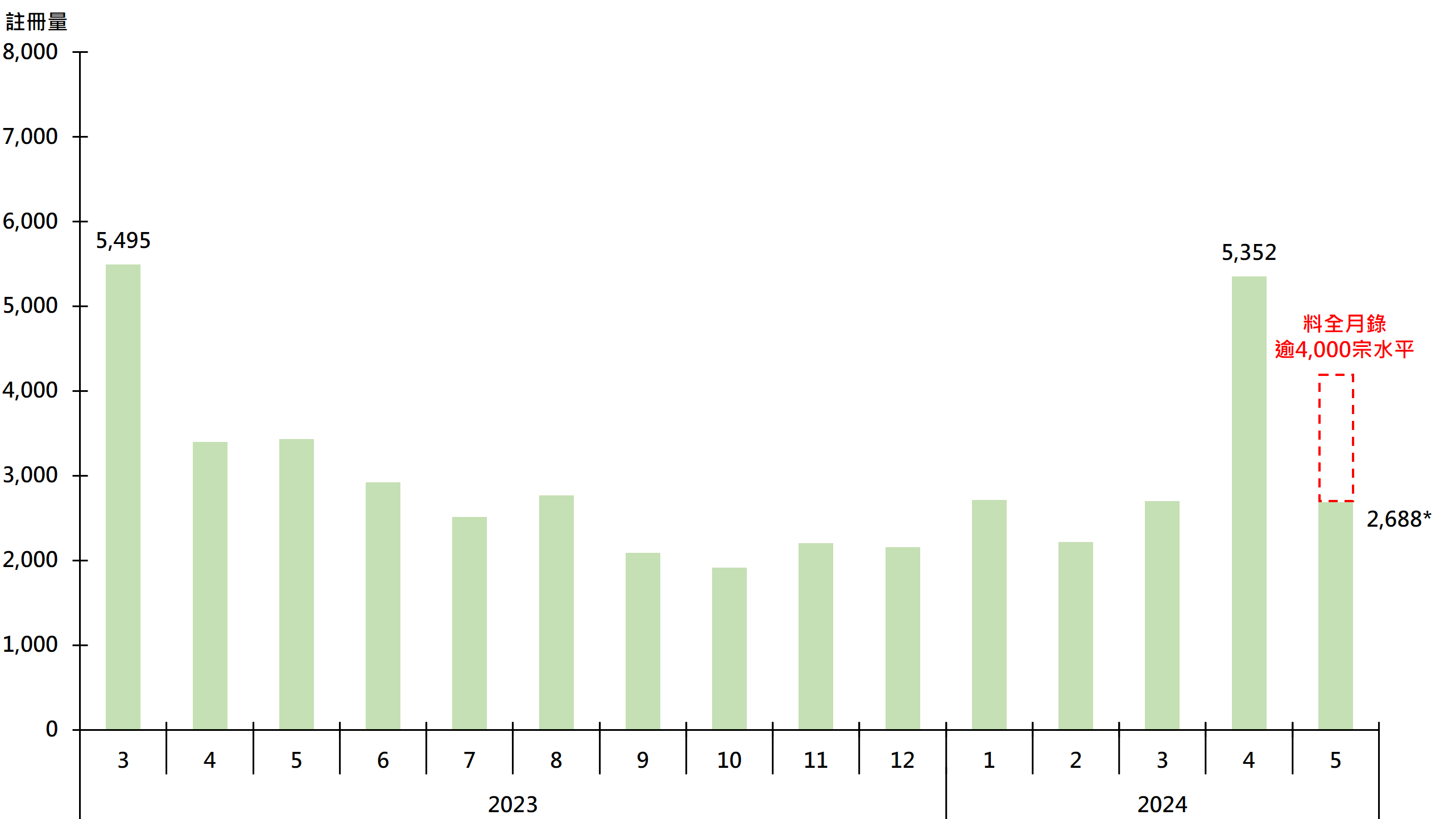 據土地註冊處資料顯示,本月至今(截至20日)二手住宅(包括二手私人住宅及二手公營房屋)錄2,688宗註冊,較上月同期的3,661宗減少約26.6%,若以目前註冊進度推算,料全月註冊量有機會突破4,000宗水平,雖然較4月全月5,352宗有所下跌,但屆時仍將創14個月次高(見圖)。鑑於簽署買賣合約至遞交到土地註冊處註冊登記需時,5月註冊個案一般主要反映4月市況。