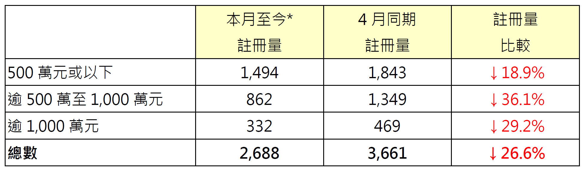 若以金額劃分二手住宅註冊量按月同期表現,當中逾500萬至1,000萬元二手住宅註冊量跌幅最大,錄862宗註冊,較上月同期的1,349宗減少約36.1%;逾1,000萬元二手住宅錄332宗註冊,較上月同期的469宗則減少約29.2%;至於500萬元或以下二手住宅錄1,494宗註冊,較上月同期的1,843宗減少約18.9%(見表)。