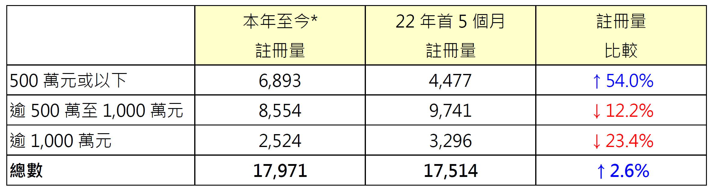 若以金額劃分本年至今二手住宅註冊量表現,當中500萬元或以下二手住宅錄6,893宗註冊,已超去年首5個月的4,477宗約54%;相反,逾500萬至1,000萬元二手住宅錄8,554宗註冊,仍較去年首5個月的9,741宗低約12.2%;逾1,000萬元二手住宅錄2,524宗註冊,仍較去年首5個月的3,296宗低約23.4%(見表)。