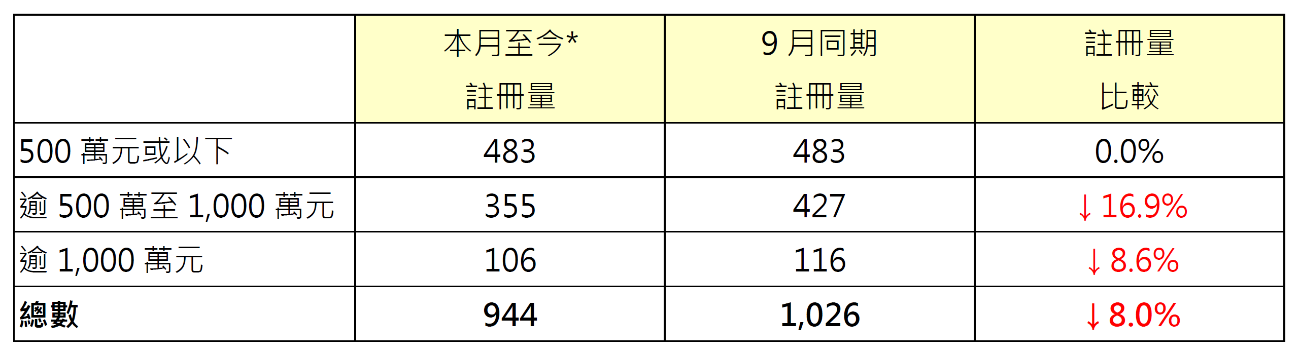 表:按金額劃分本月至今*二手住宅註冊量