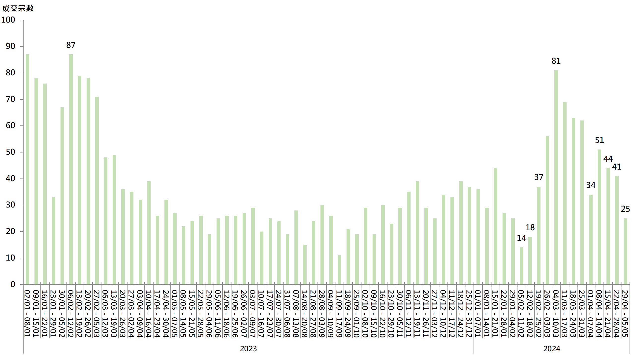 圖︰20大屋苑每周二手買賣成交宗數走勢