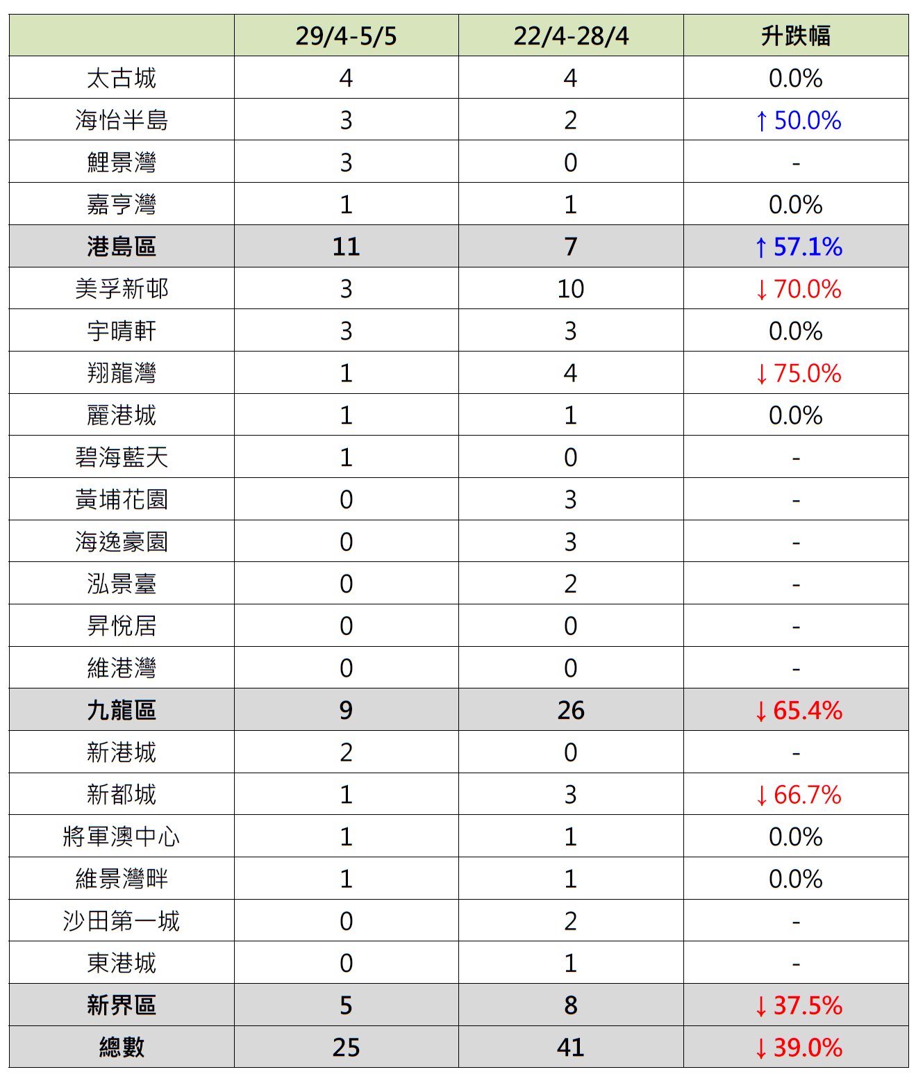反觀,港島區4個指標屋苑上周錄11宗成交,較前周的7宗增加約57.1%;當中海怡半島錄3宗成交,較前周的2宗增加50%;鯉景灣「破蛋」,按周增加3宗成交。
