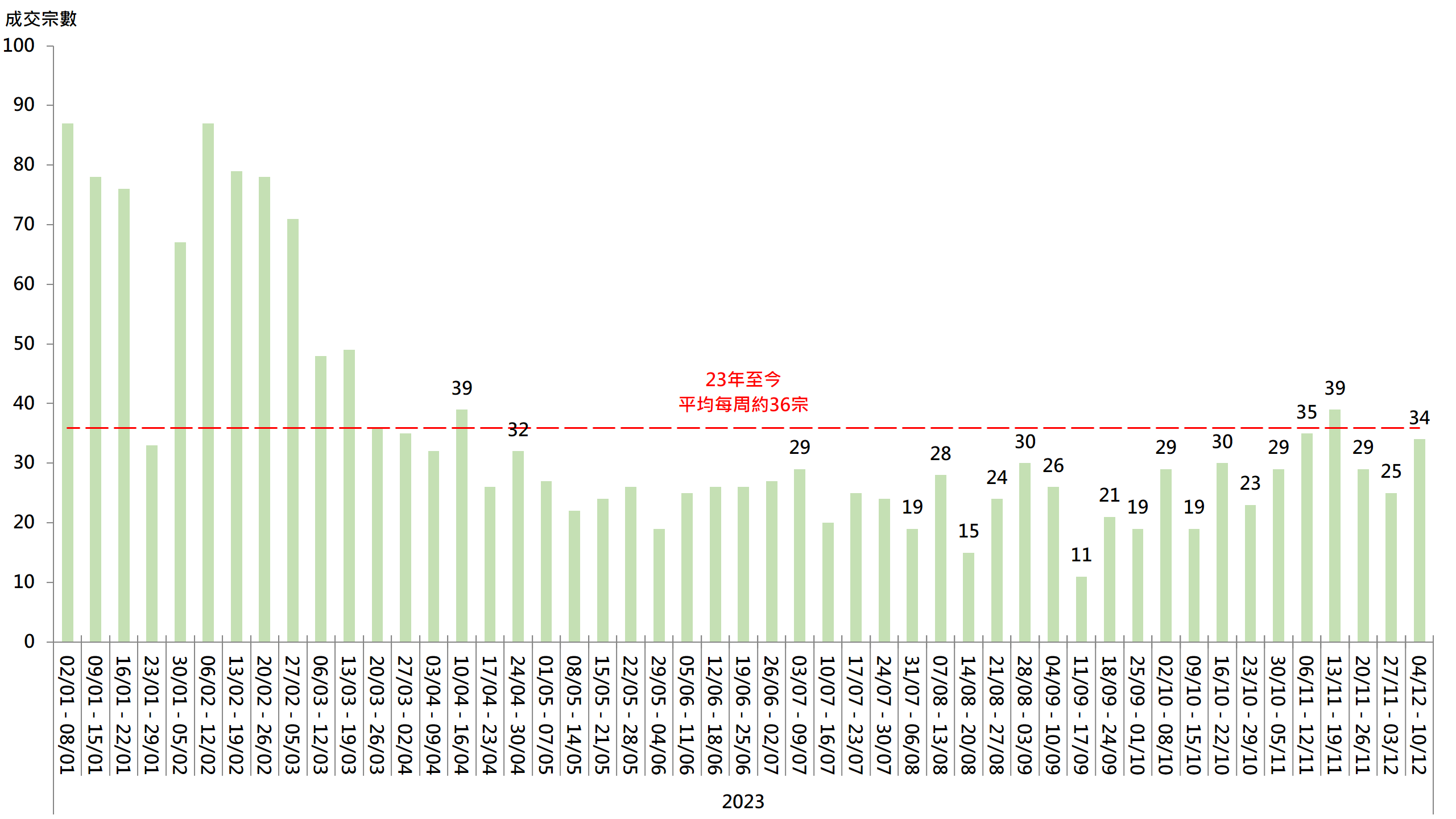 據本行前線分行所錄得的數字顯示,綜合過去一星期(12月4日至12月10日)全港20大主要屋苑二手買賣錄34宗成交,較前周(11月27日至12月3日)的25宗增加36%;縱使上周二手交投回升,但比起本年至今平均每周約36宗仍低約6%(見圖)。