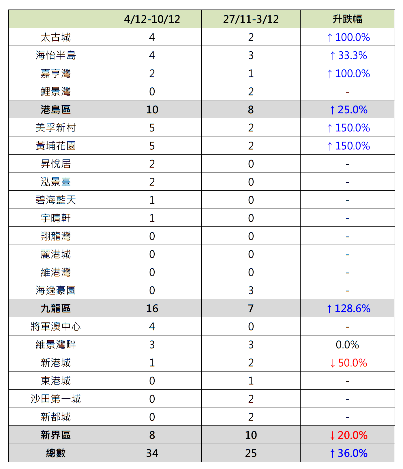 港島區4個指標屋苑上周錄10宗成交,按周增加25%;當中海怡半島錄4宗成交,按周增加約33.3%;太古城及嘉亨灣分別錄得4宗及2宗成交,按周同樣增加1倍;相反,鯉景灣由前周錄2宗成交減少至上周「零成交」。