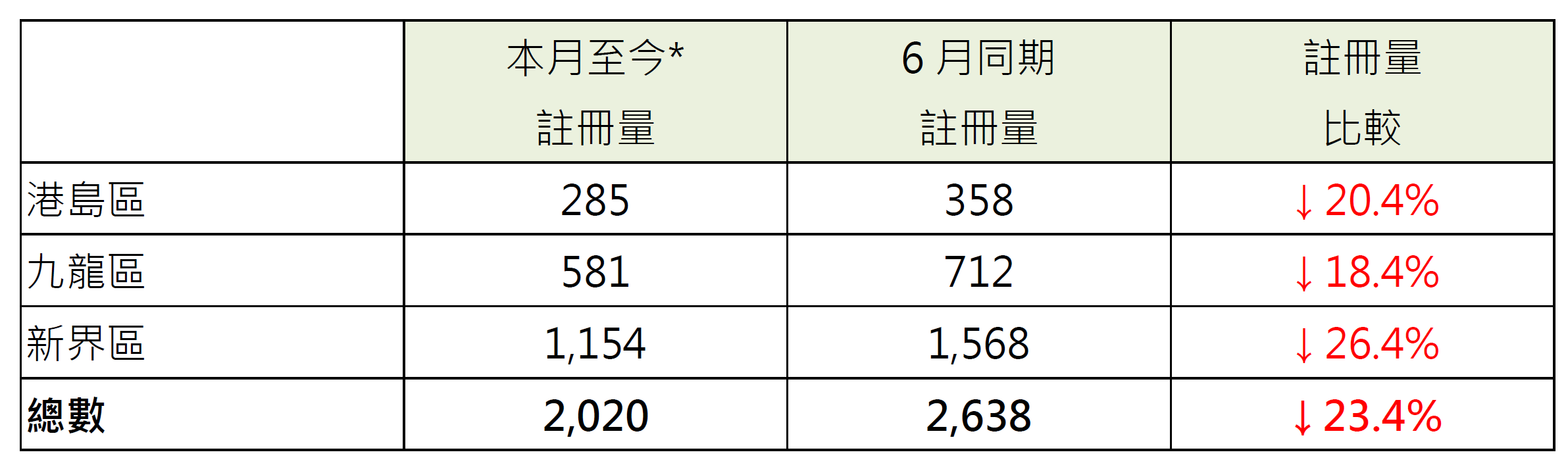 若以港島、九龍及新界三區劃分本月至今住宅物業註冊量表現,當中九龍區錄581宗註冊,較6月同期的712宗減少約18.4%;港島區錄285宗註冊,較6月同期的358宗減少約20.4%;新界區錄1,154宗註冊,較6月同期的1,568宗減少約26.4%(見表)。