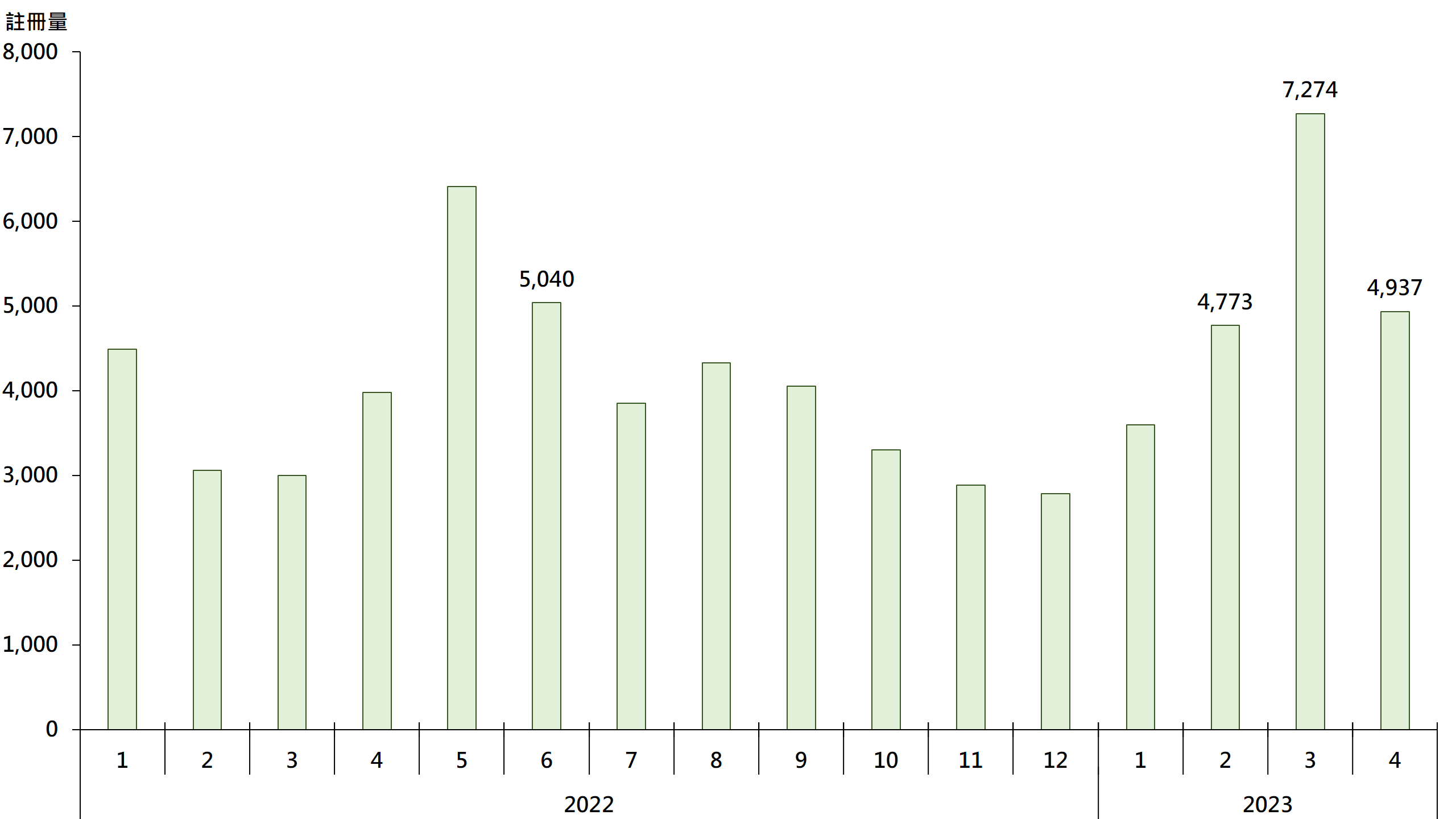 內地與香港於年初通關,帶旺香港樓市氣氛,今年一二手交投表現不俗;據土地註冊處最新資料顯示,4月整體住宅物業(包括一手私宅,二手住宅,但撇除一手公營房屋)錄4,937宗註冊,雖較3月的7,274宗減少約32.1%,但仍創10個月次高(見圖)。鑑於簽署買賣合減少約至遞交到土地註冊處註冊登記需時,4月註冊個案一般主要反映3月市況。