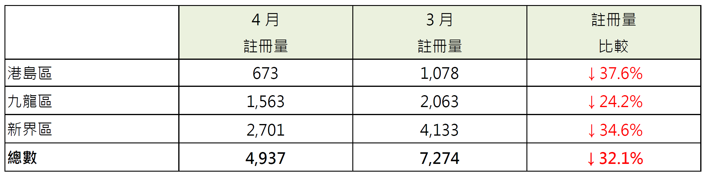 若以港島、九龍及新界三區劃分4月住宅物業註冊量表現,當中九龍區錄1,563宗註冊,較3月的2,063宗減少約24.2%;新界區錄2,701宗註冊,較3月的4,133宗減少約34.6%;港島區錄673宗註冊,較3月的1,078宗減少約37.6%(見表)。