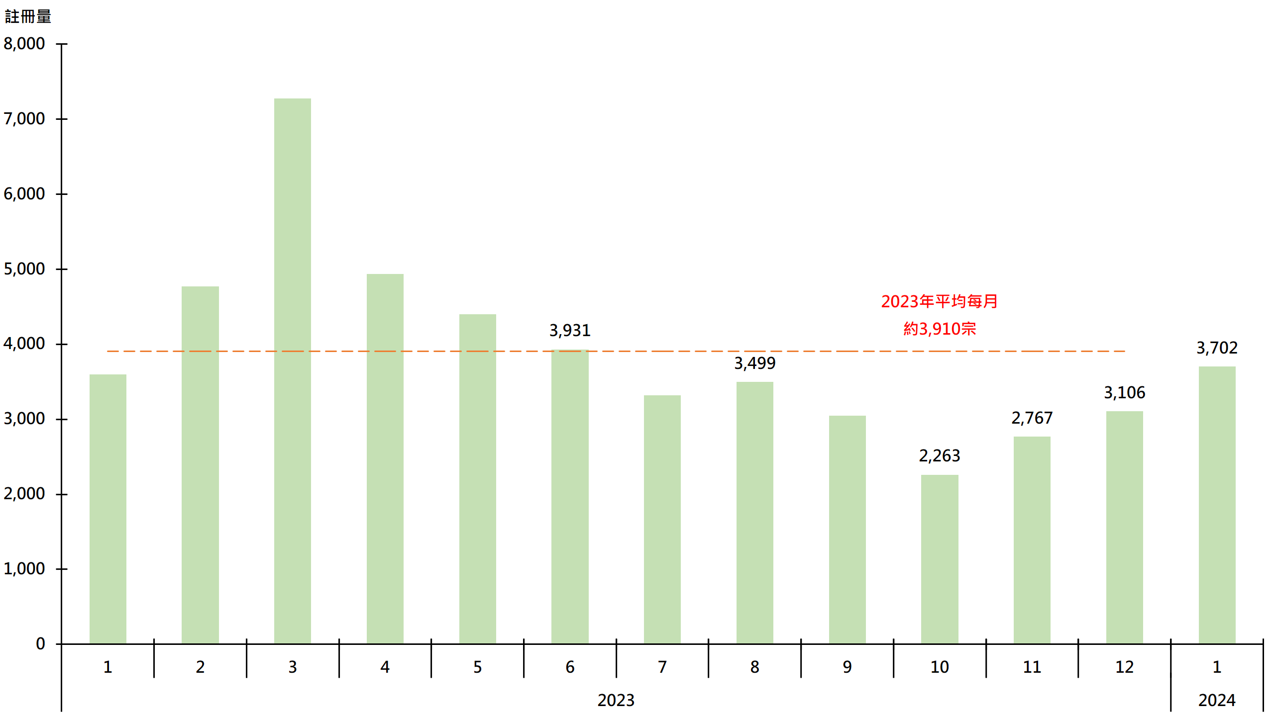 據土地註冊處最新資料顯示,1月住宅物業(包括一手私宅,二手私宅及二手公營房屋)錄3,702宗註冊,較23年12月的3,106宗增加約19.2%,連升3個月,創7個月新高,惟仍較2023年平均每月約3,910宗低約5.3%(見圖)。鑑於簽署買賣合約至遞交到土地註冊處註冊登記需時,2024年1月註冊個案一般主要反映2023年12月市況。