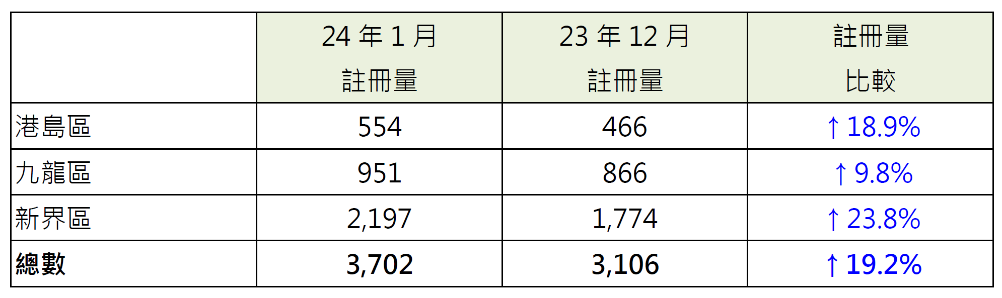 若以港島、九龍及新界三區劃分1月住宅物業註冊量表現,當中新界區錄2,197宗註冊,較23年12月的1,774宗增加約23.8%;港島區錄554宗註冊,較23年12月的466宗增加約18.9%;九龍區錄951宗註冊,較23年12月的866宗增加約9.8%(見表)。