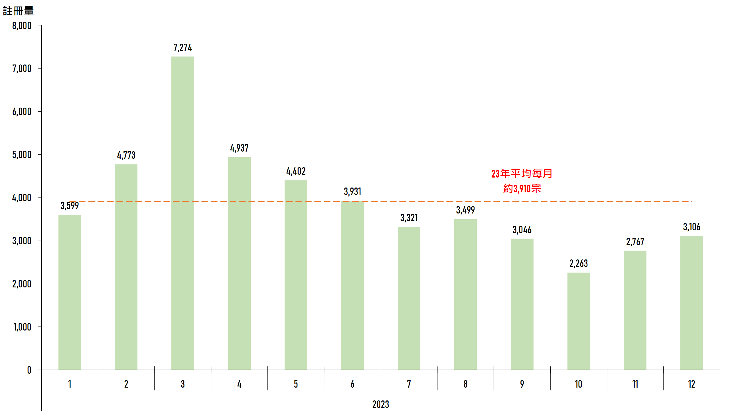 據土地註冊處最新資料顯示,2023年12月整體住宅物業(包括一手私宅,二手私宅及二手公營房屋)錄3,106宗註冊,較去年11月的2,767宗按月增加約12.3%,並創4個月新高,惟較2023年平均每月約3,910宗低約2成,反映12月整體住宅物業註冊量仍處於較低水平(見圖)。鑑於簽署買賣合約至遞交到土地註冊處註冊登記需時,12月註冊個案一般主要反映11月市況。