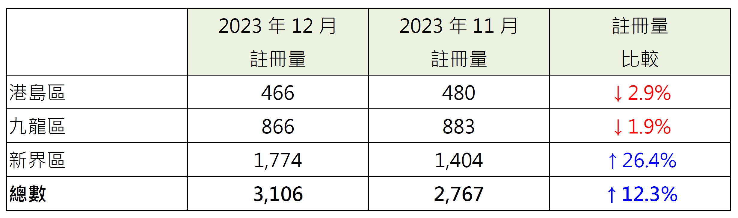 若以港島、九龍及新界三區劃分12月住宅物業註冊量表現,當中新界區錄1,774宗註冊,較11月的1,404宗增加約26.4%;相反,九龍區錄866宗註冊,較11月的883宗減少約1.9%;港島區錄466宗註冊,較11月的480宗減少約2.9%(見表)。