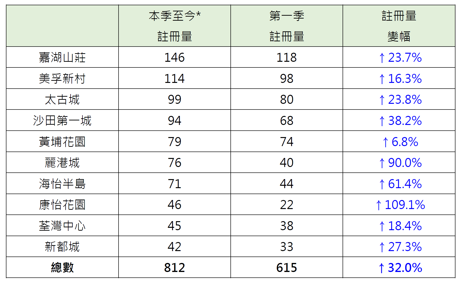 至於本季至今十大傳統屋苑二手住宅註冊量排名方面,嘉湖山莊以146宗註冊居榜首,較首季的118宗增加約23.7%;美孚新村以114宗註冊排第二,較首季的98宗增加約16.3%;太古城以99宗註冊排第三,較首季的80宗增加約23.8%(見表)。