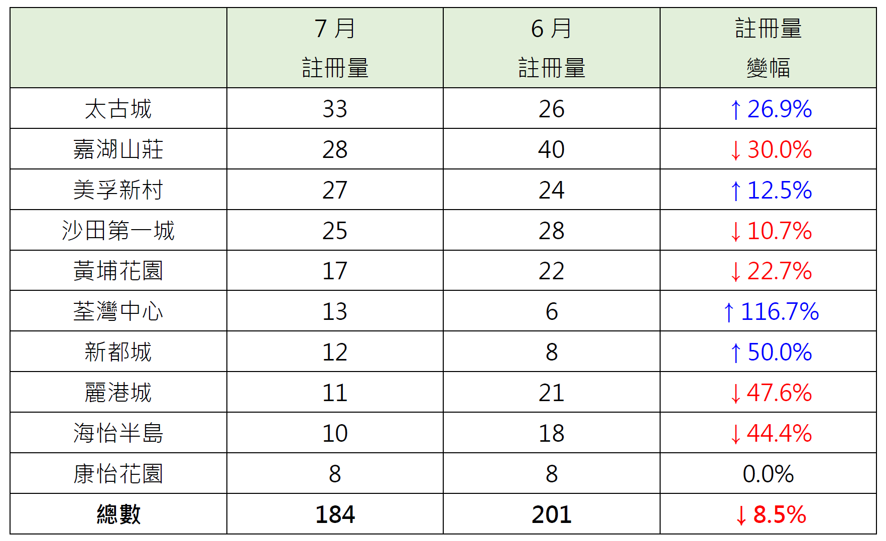 另有4個屋苑7月註冊量按月報升,當中荃灣中心錄13宗註冊,較6月的6宗增加逾1.1倍;新都城錄12宗註冊,較6月的8宗增加50%;太古城錄33宗註冊,較6月的26宗增加約26.9%;至於康怡花園宗數則按月持平,維持8宗。