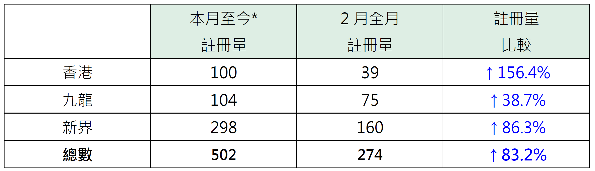 若以三區劃分本月至今純車位註冊量表現,當中港島區錄100宗註冊,較2月全月的39宗高出近1.6倍;新界區錄298宗註冊,較2月全月的160宗高出約86.3%;九龍區錄104宗註冊,較2月全月的75宗高出約38.7%(見表)。