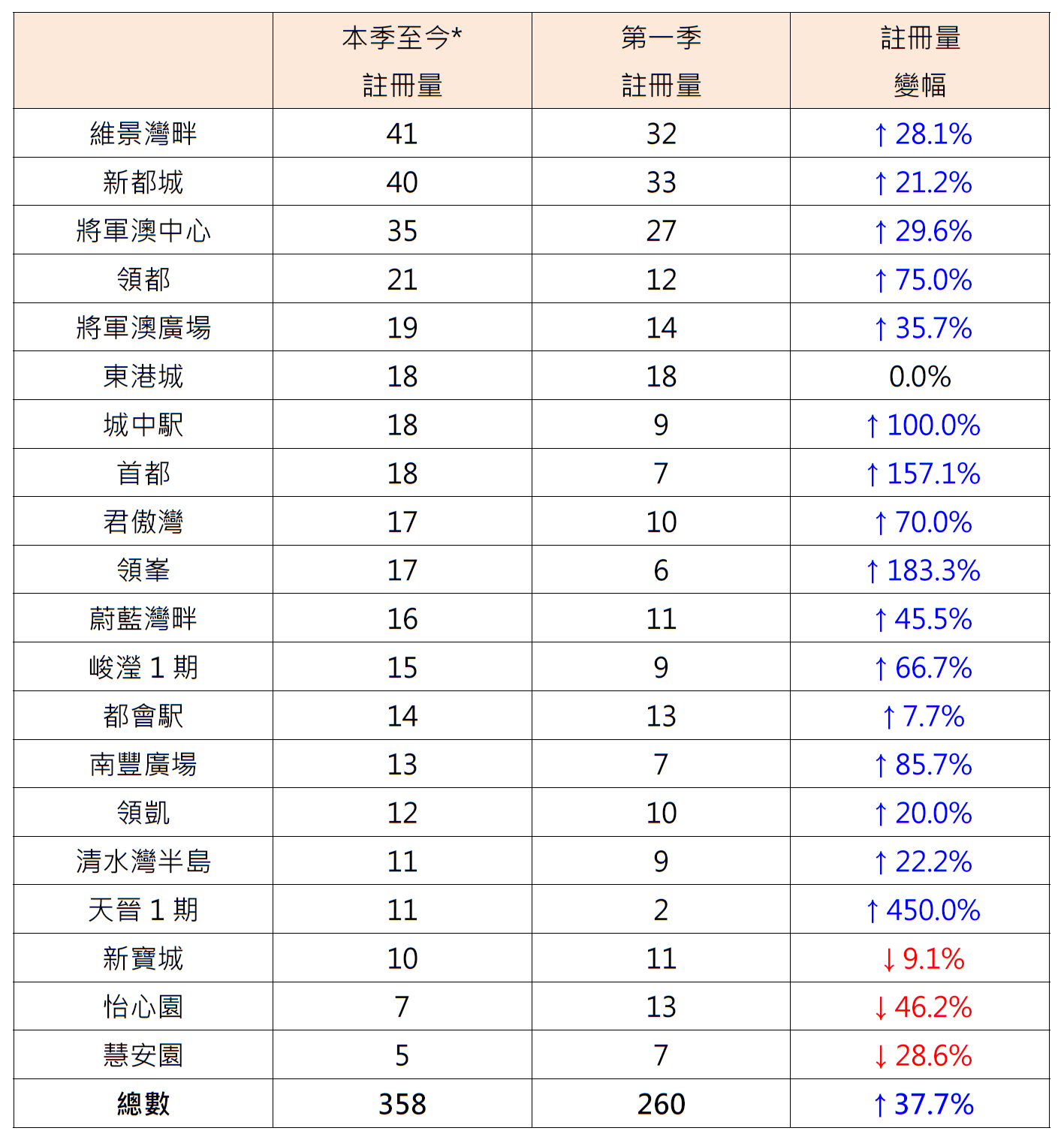 表:本季至今*將軍澳區20個私人屋苑二手住宅註冊量
