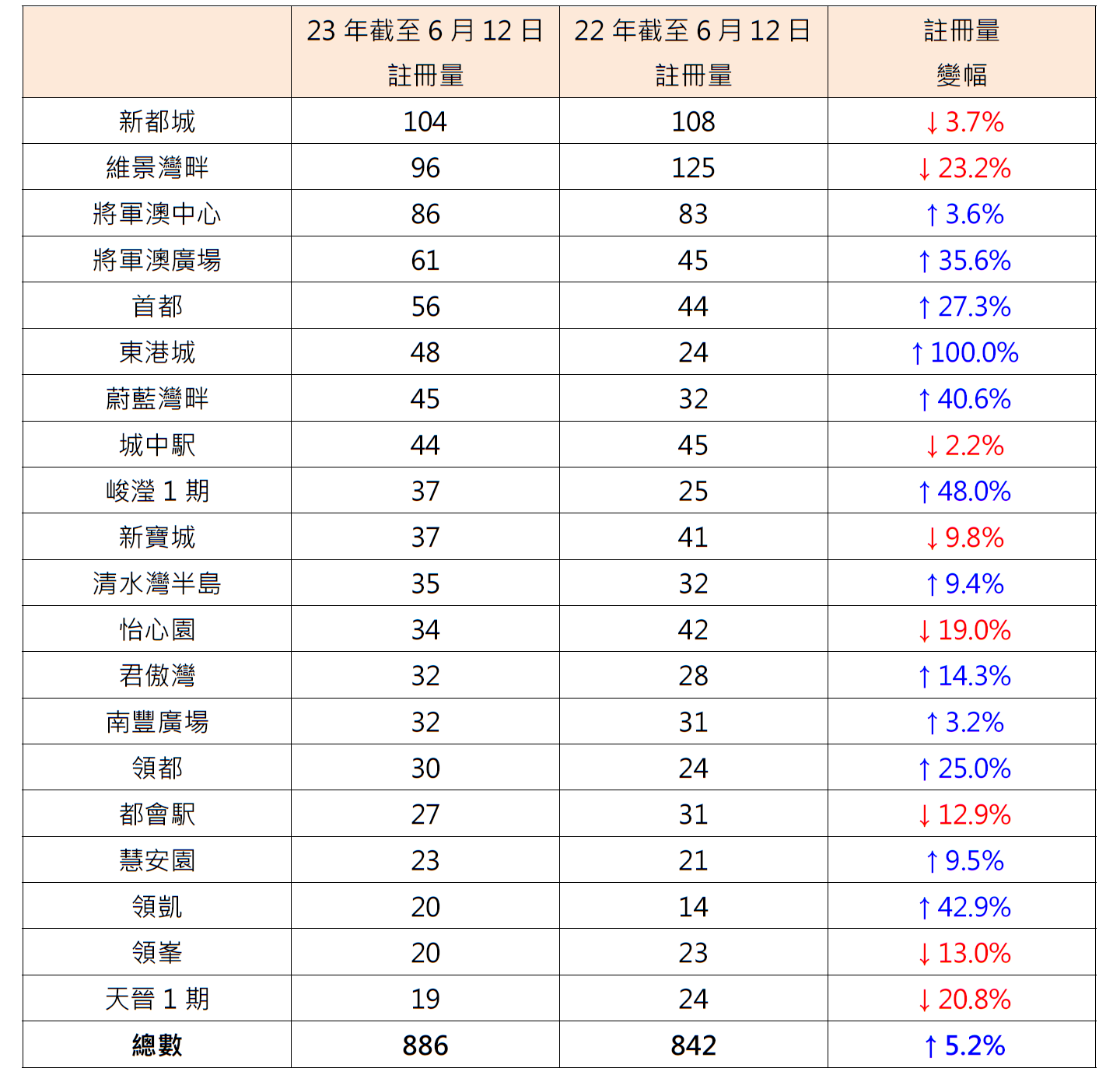 據土地註冊處資料顯示,本年至今(截至6月12日)將軍澳區20個私人屋苑錄886宗註冊,較去年同期的842宗增加約5.2%。