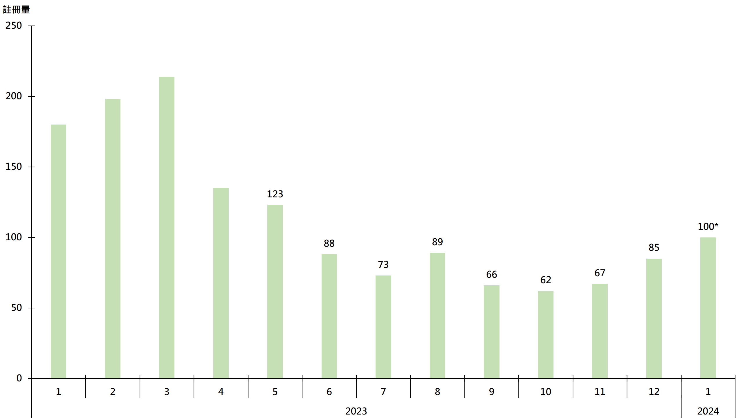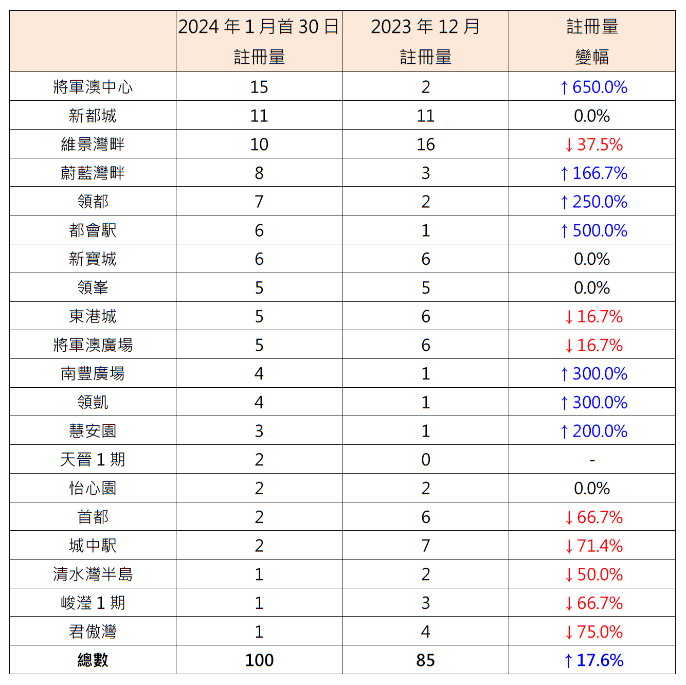 據土地註冊處資料顯示,1月至今(截至30日)將軍澳區20個私人屋苑錄100宗註冊,已超越去年12月全月的85宗約17.6%,創8個月新高(見圖)。鑑於簽署買賣合約至遞交到土地註冊處註冊登記需時,2024年1月註冊個案一般主要反映2023年12月市況。