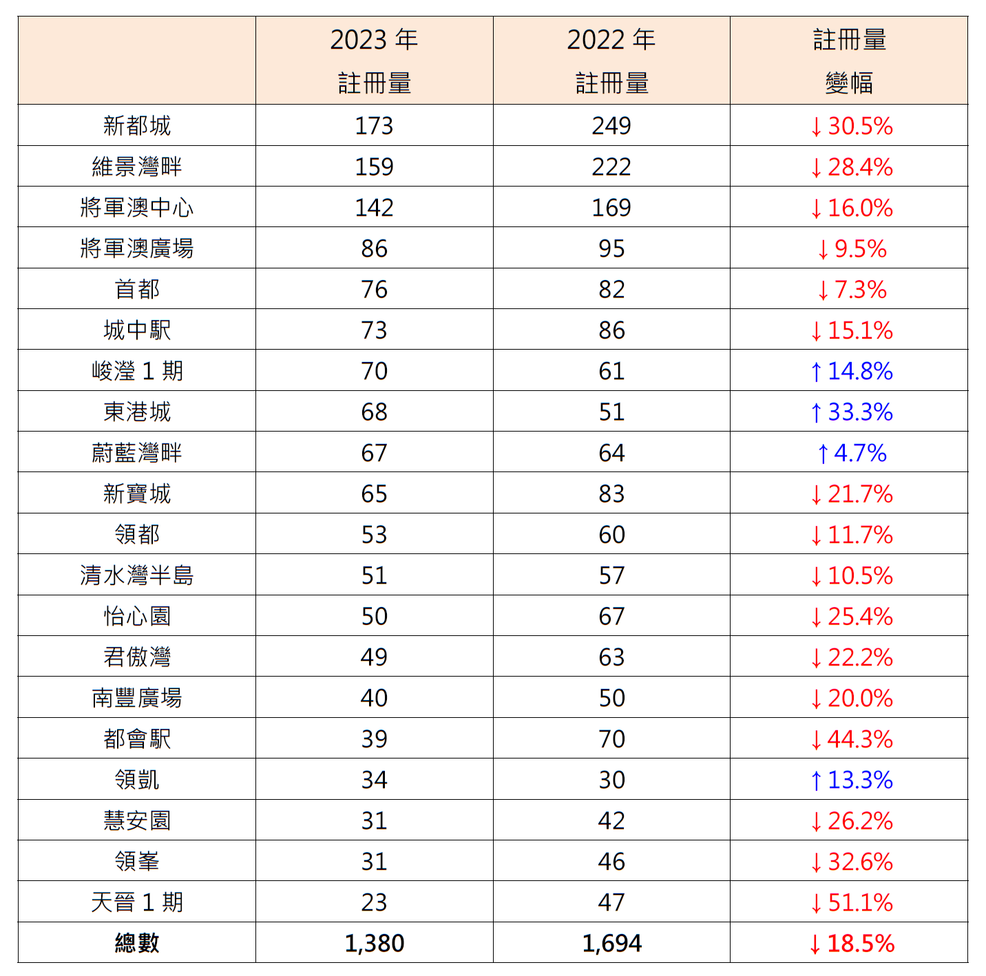 【將軍澳20個私人屋苑】2023年註冊量跌近2成輸大市!
