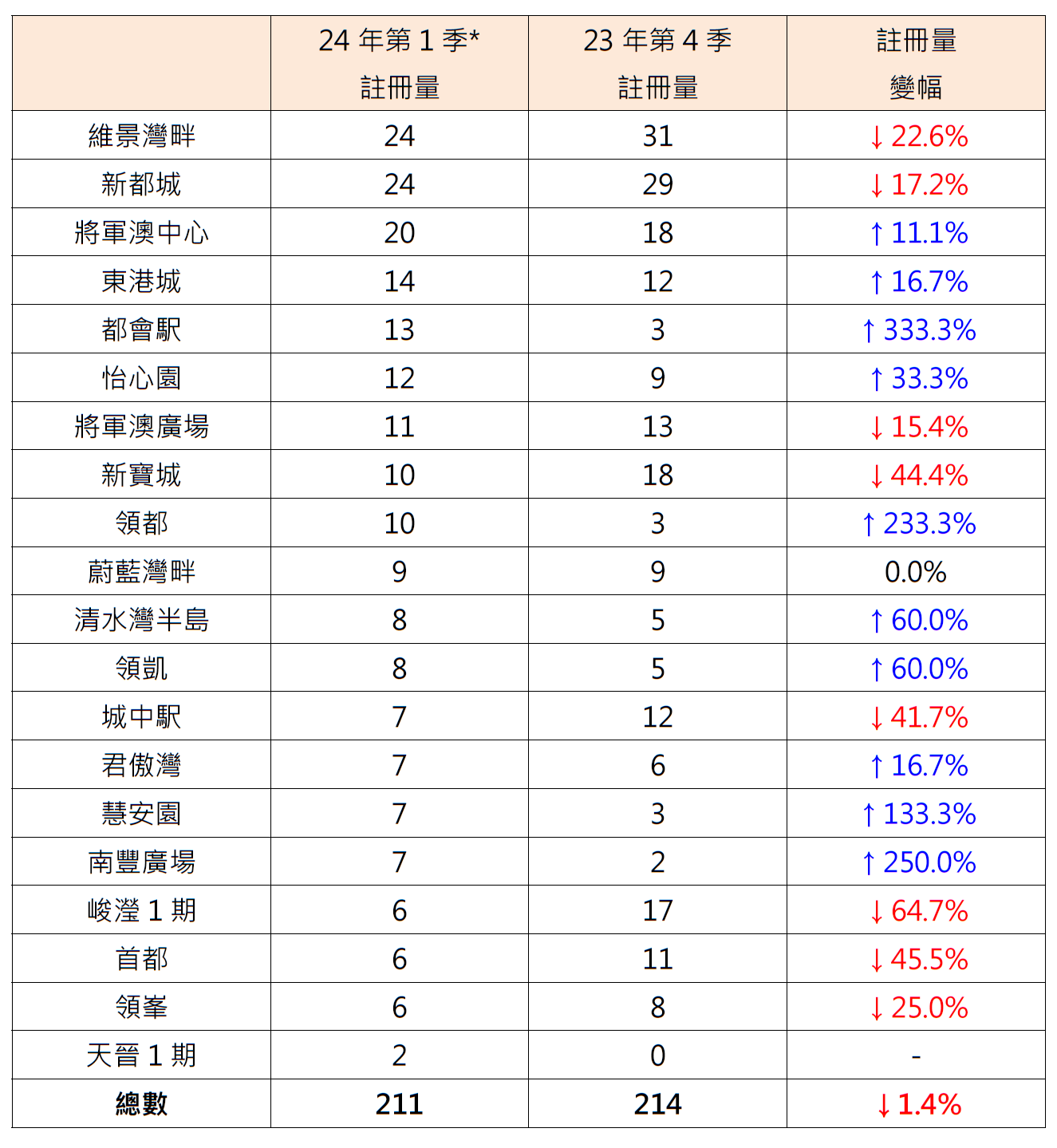 至於本季至今將軍澳區20個私人屋苑二手住宅註冊量排名方面,維景灣畔及新都城各以24宗註冊並居榜首,其中維景灣畔仍較上季全季的31宗低約22.6%,新都城仍較上季全季的29宗低約17.2%;將軍澳中心以20宗註冊排第三,已超上季全季的18宗約11.1%(見表)。