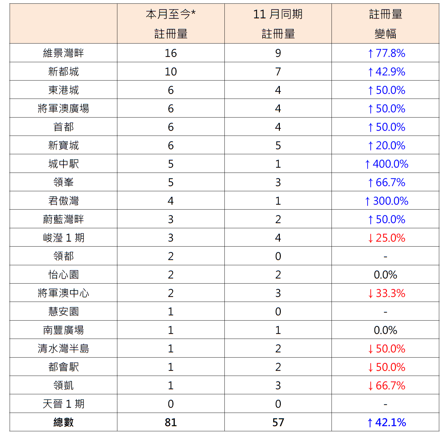 據土地註冊處資料顯示,本月至今(截至28日)二手住宅錄2,048宗註冊,較上月同期的1,982宗增加約3.3%;當中將軍澳區20個私人屋苑錄81宗註冊,較上月同期的57宗增加約42.1%跑贏大市,並較上月全月67宗更高,暫創4個月新高(見圖)。鑑於簽署買賣合約至遞交到土地註冊處註冊登記需時,12月註冊個案一般主要反映11月市況。