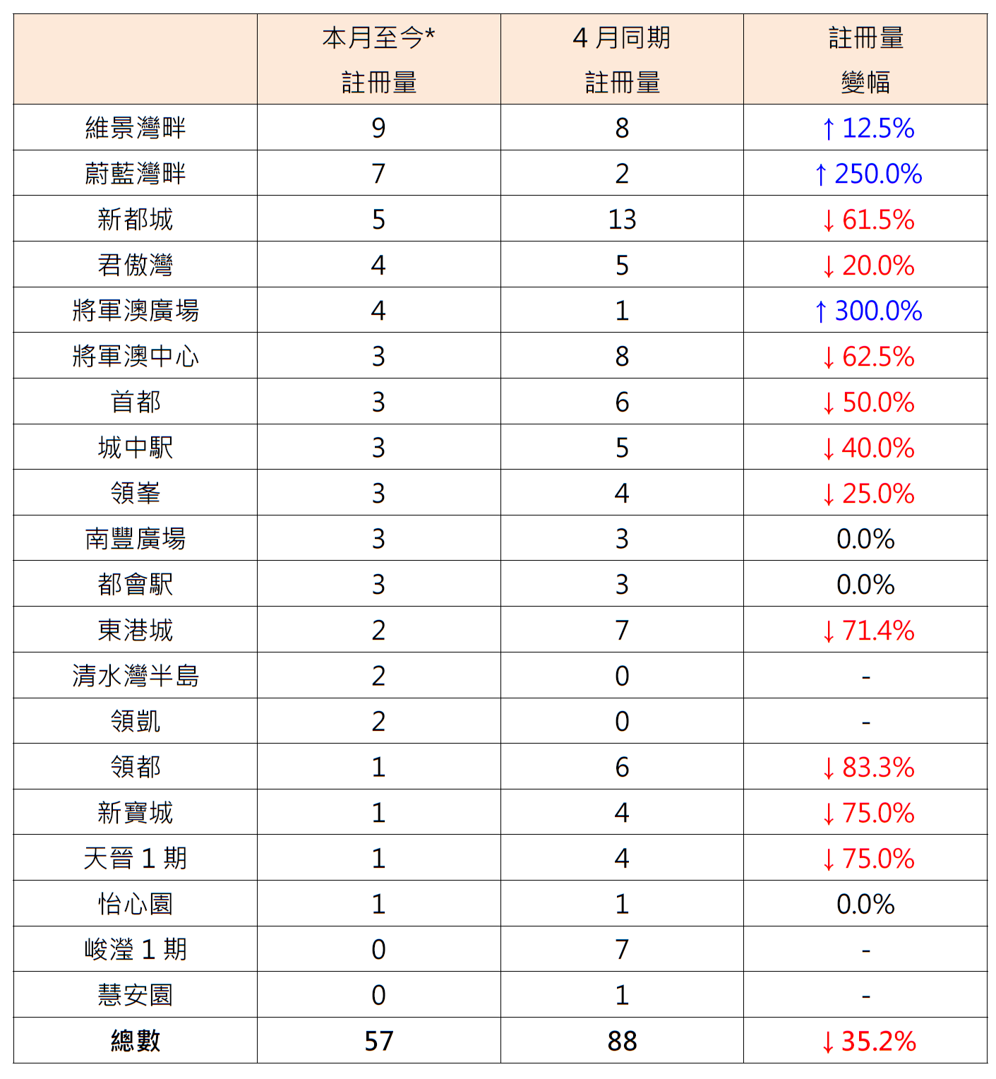 據土地註冊處資料顯示,本月至今(截至16日)將軍澳區20個私人屋苑錄57宗註冊,較上月同期的88宗減少約35.2%。鑑於簽署買賣合約至遞交到土地註冊處註冊登記需時,5月註冊個案一般主要反映4月市況。