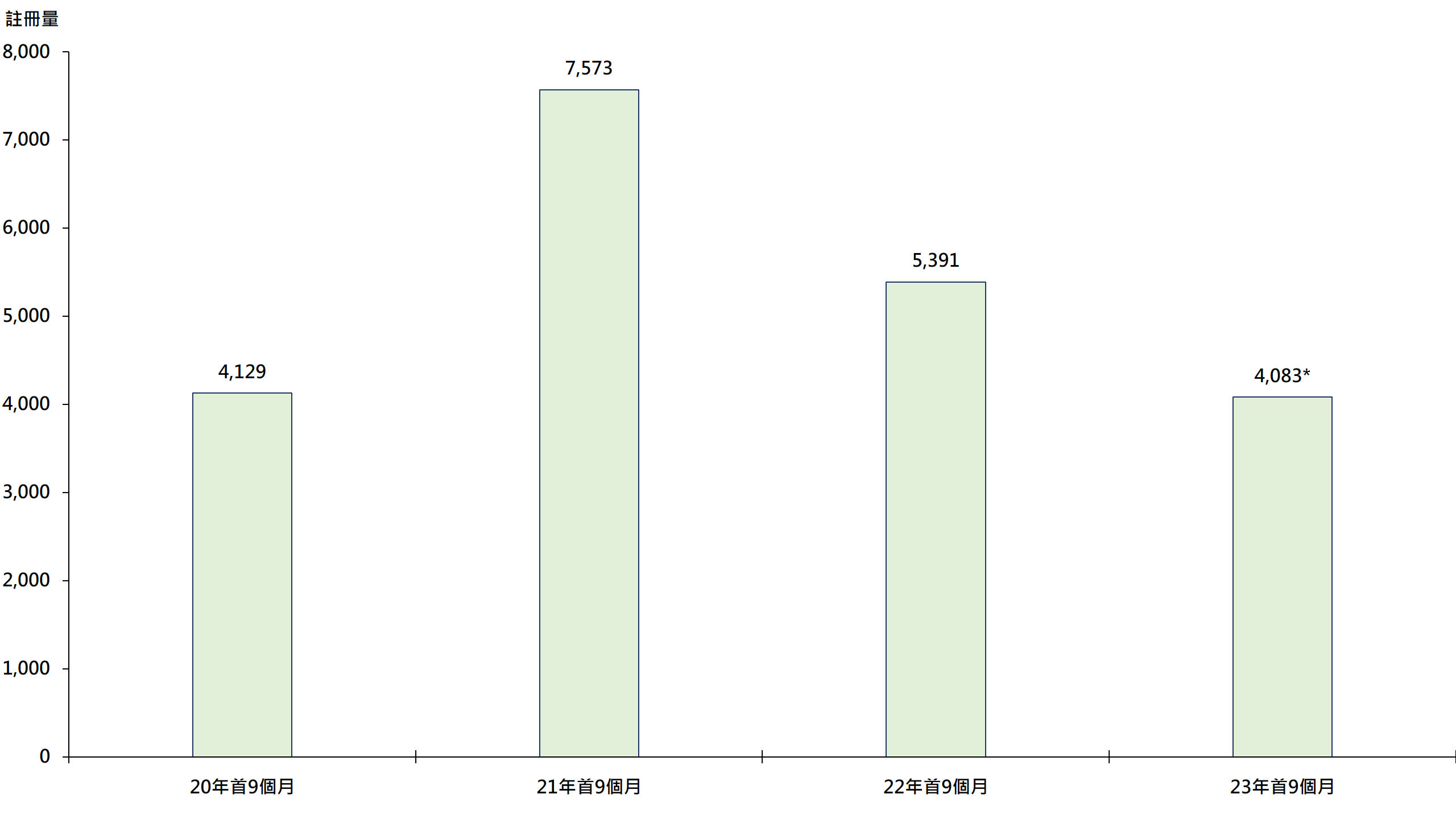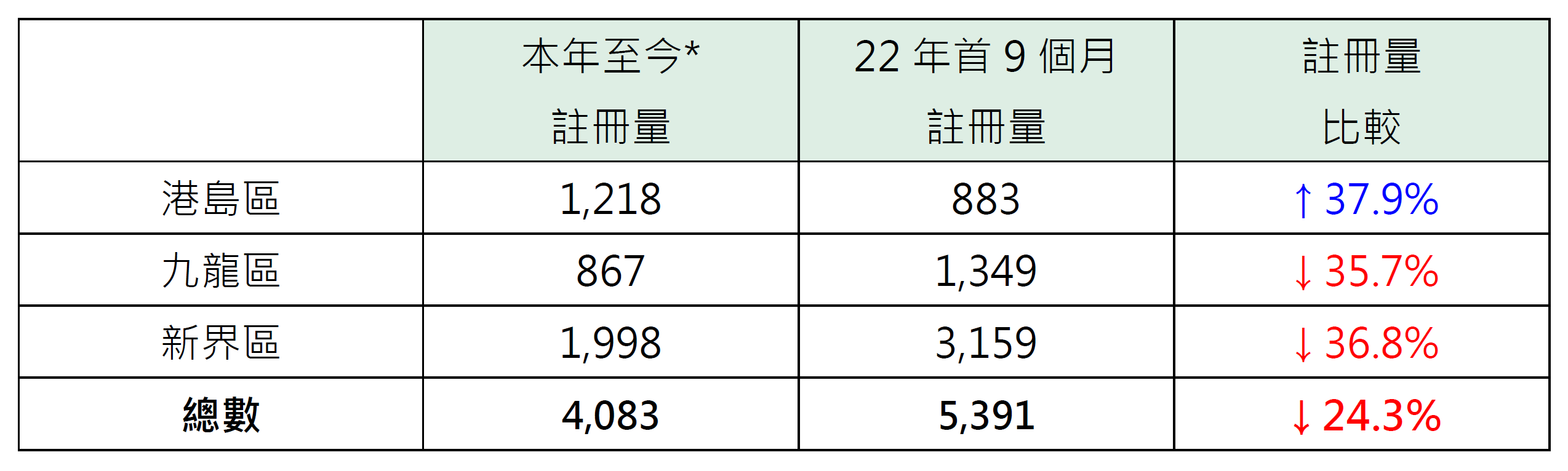 若以金額劃分本年至今純車位註冊量表現,其中價值200萬元以上純車位錄1,080宗註冊,較去年首9個月的1,602宗減少約32.6%;價值100萬元或以下純車位錄918宗註冊,較去年首9個月的1,302宗減少約29.5%;價值100萬以上至200萬元純車位錄2,085宗註冊,較去年首9個月的2,487宗減少約16.2%。