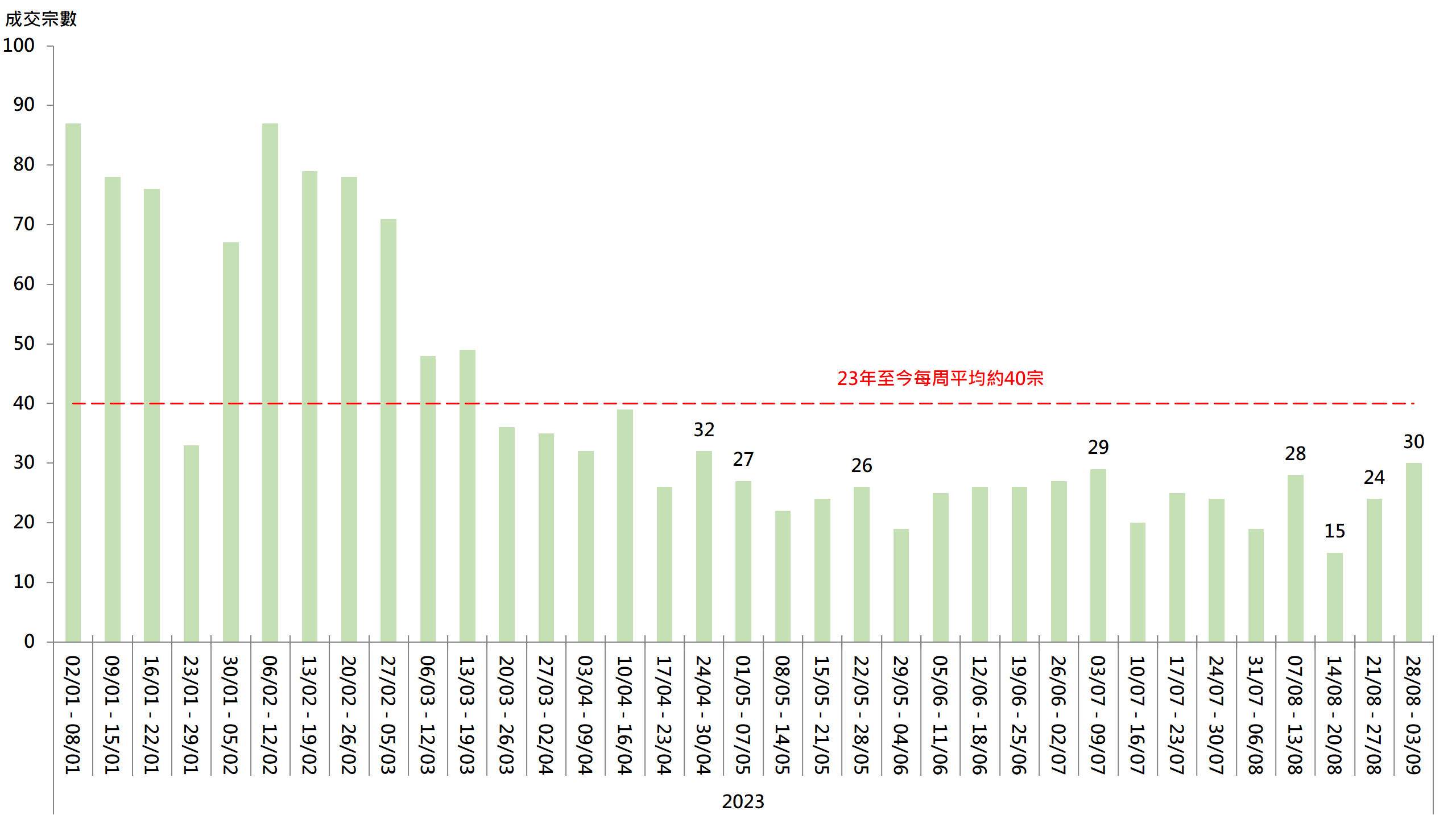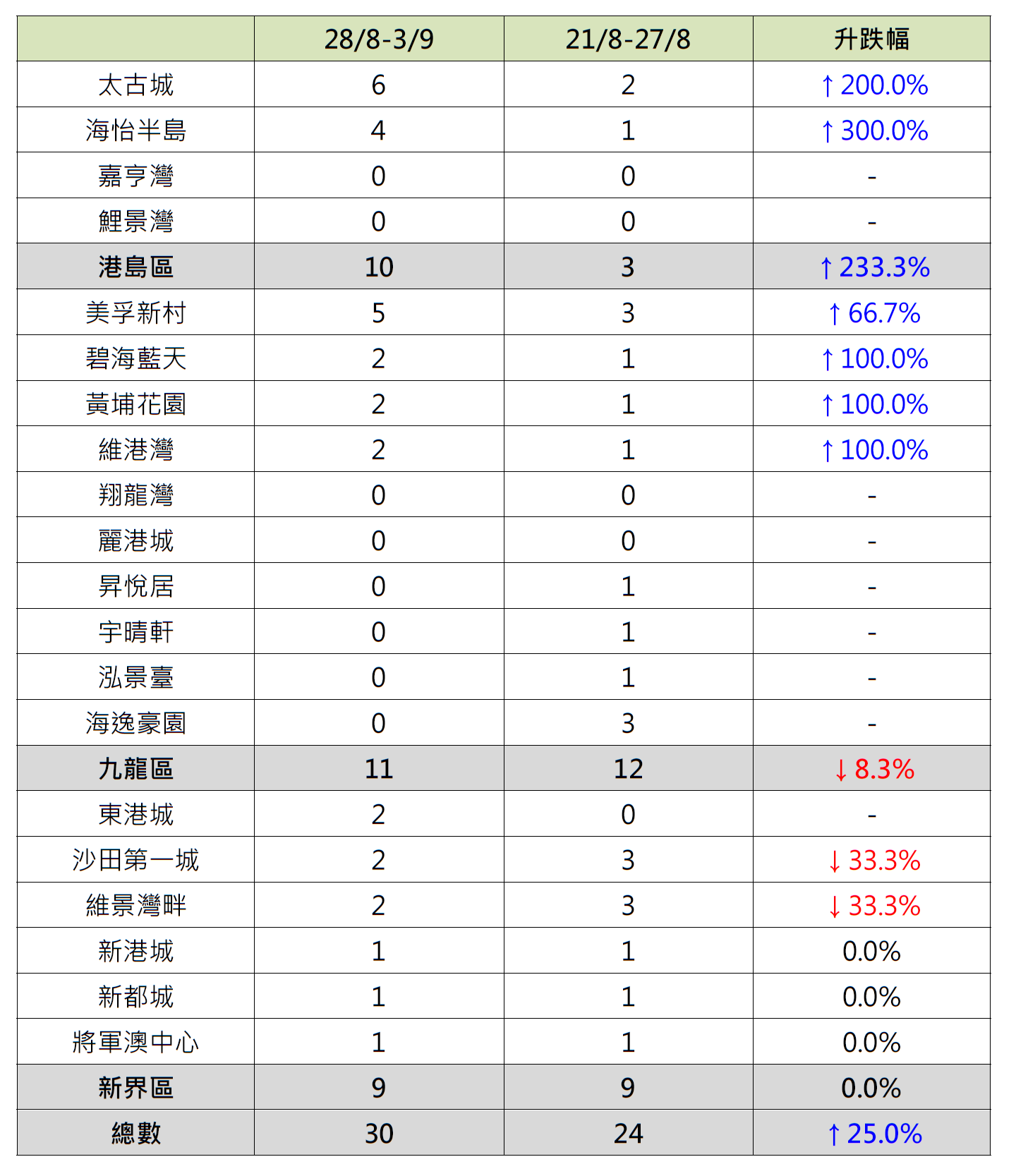 值得留意,上周20大屋苑錄30宗成交,其中有24宗於上周一至四(8月28日至31日)成交,佔上周總數8成;之後受颱風吹襲影響,上周五至日(9月1日至3日)20大屋苑只錄6宗成交,僅佔上周總數2成,亦較前周同期(8月25日至27日)的11宗減少約45.5%。