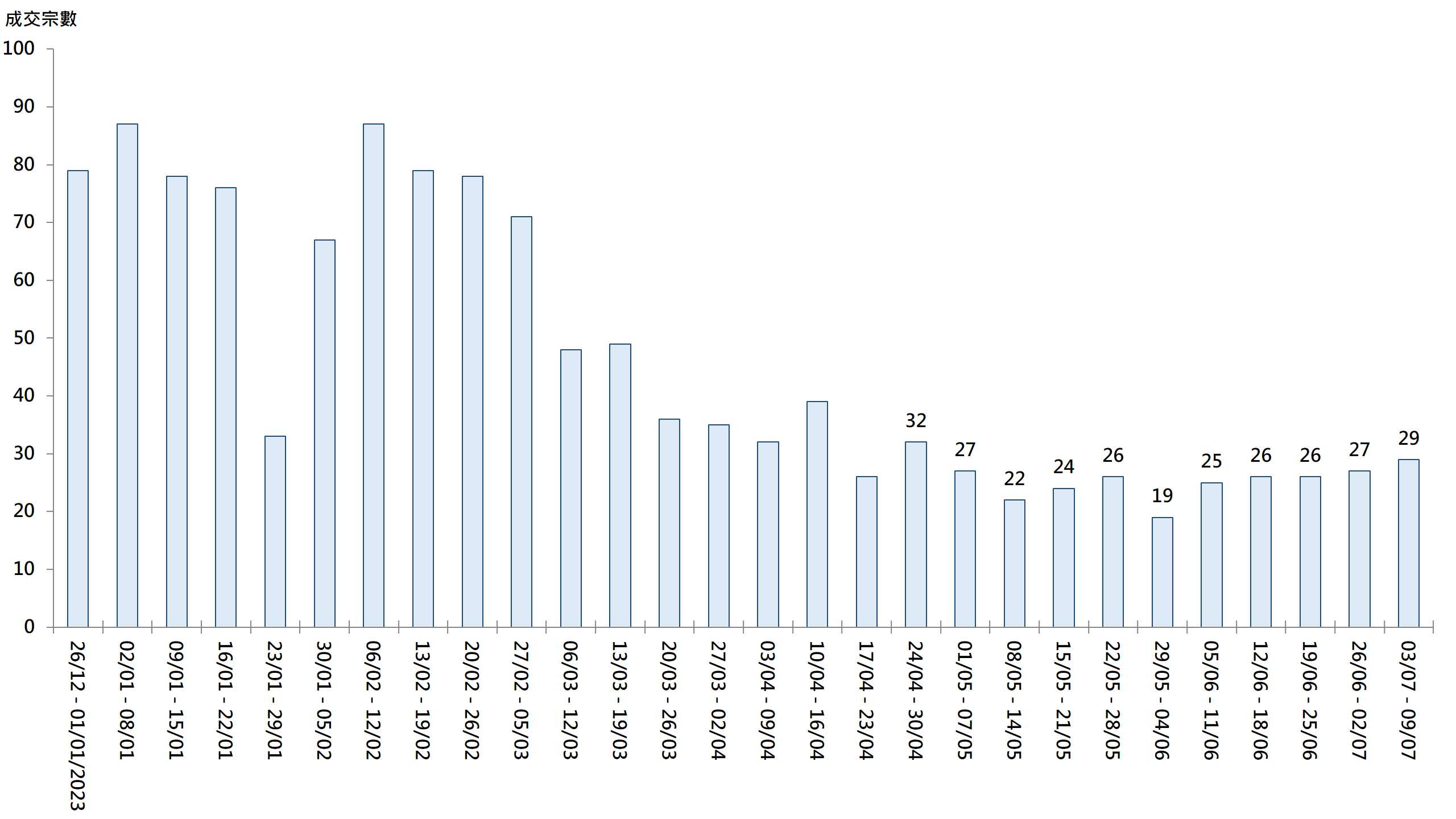 據本行前線分行所錄得的數字顯示,綜合過去一星期(7月3日至7月9日)全港20大主要屋苑二手買賣錄29宗成交,較前周(6月26日至7月2日)的27宗增加約7.4%(見圖)。政府於上周五(7月7日)放寬自住物業最高按揭成數及按揭保險計劃,有利二手市場氣氛;值得留意,上周20大屋苑交投表現尚未完全反映。
