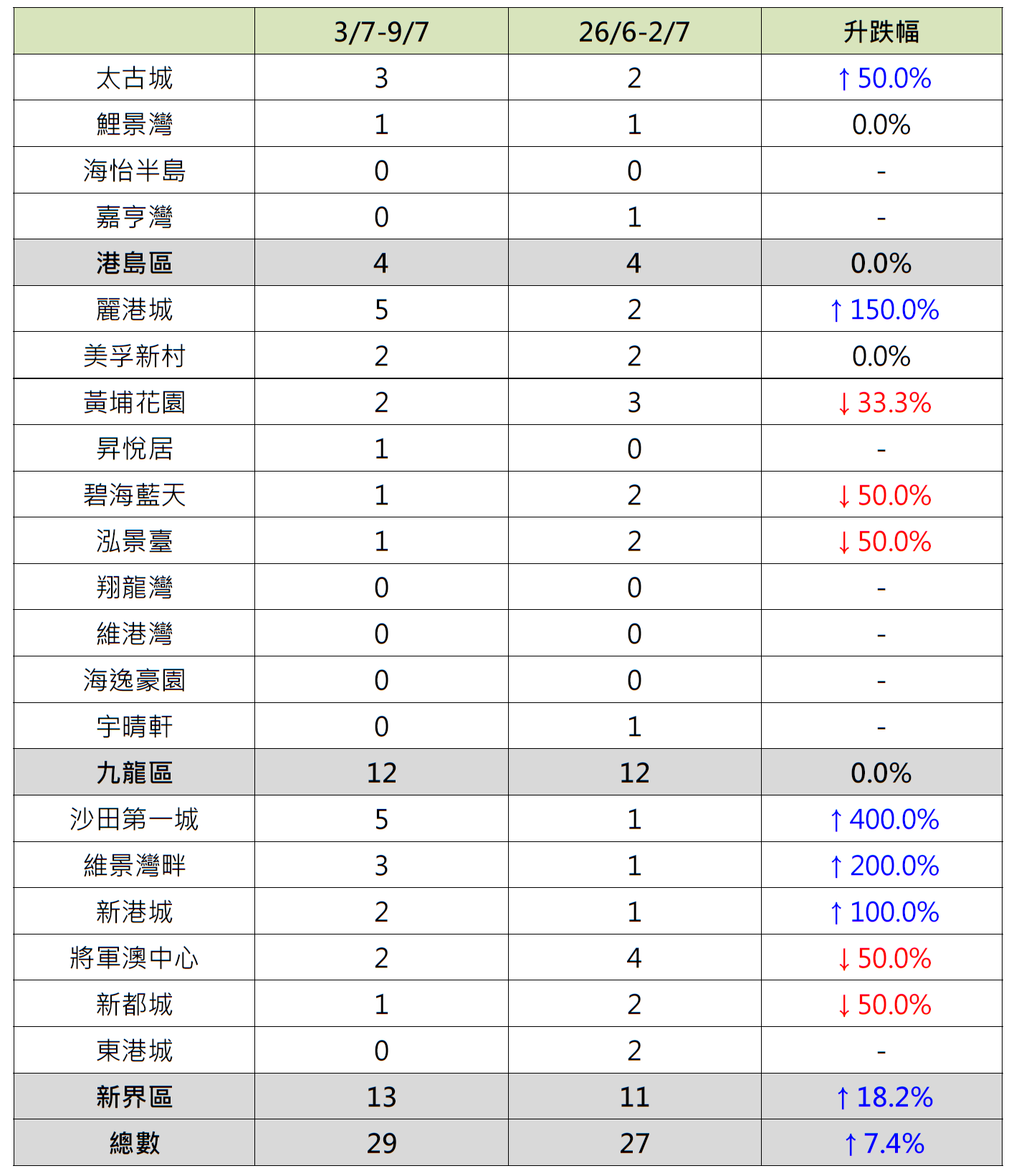 至於上周「零成交」屋苑數目共有7個,按周增加2個,佔20大屋苑比率增加至35%,當中包括海怡半島、嘉亨灣、翔龍灣、維港灣、海逸豪園、宇晴軒及東港城(見表)。