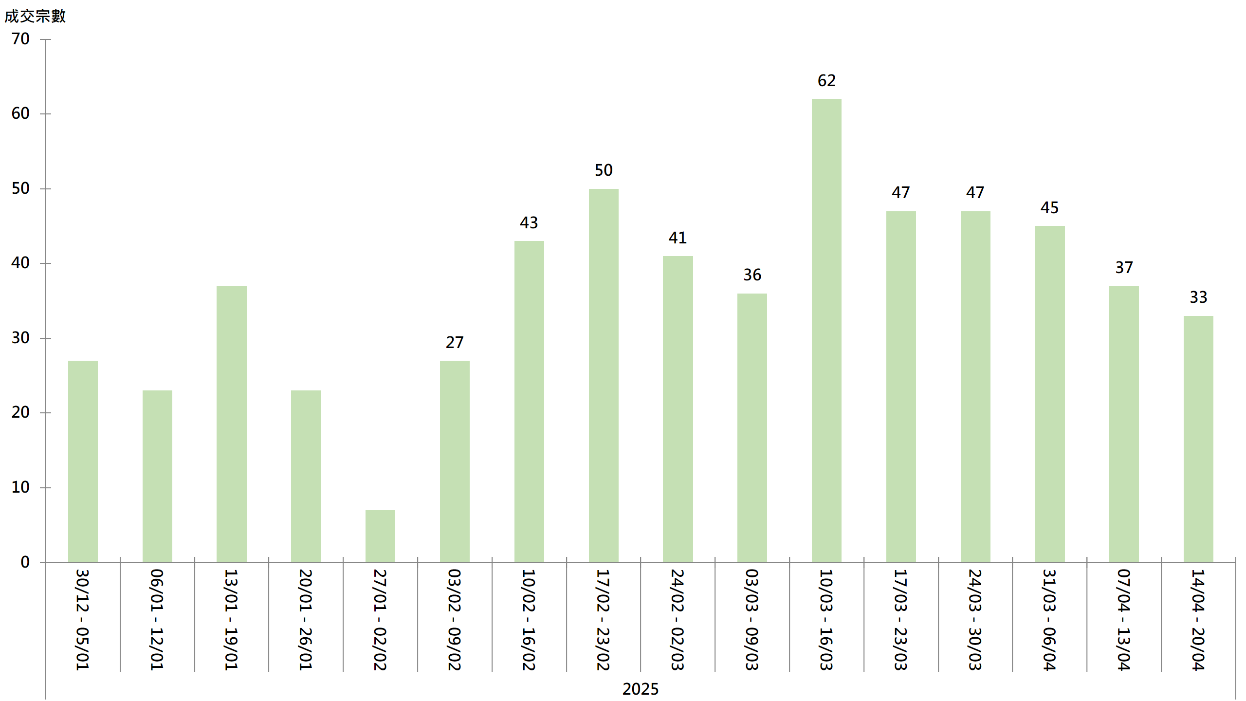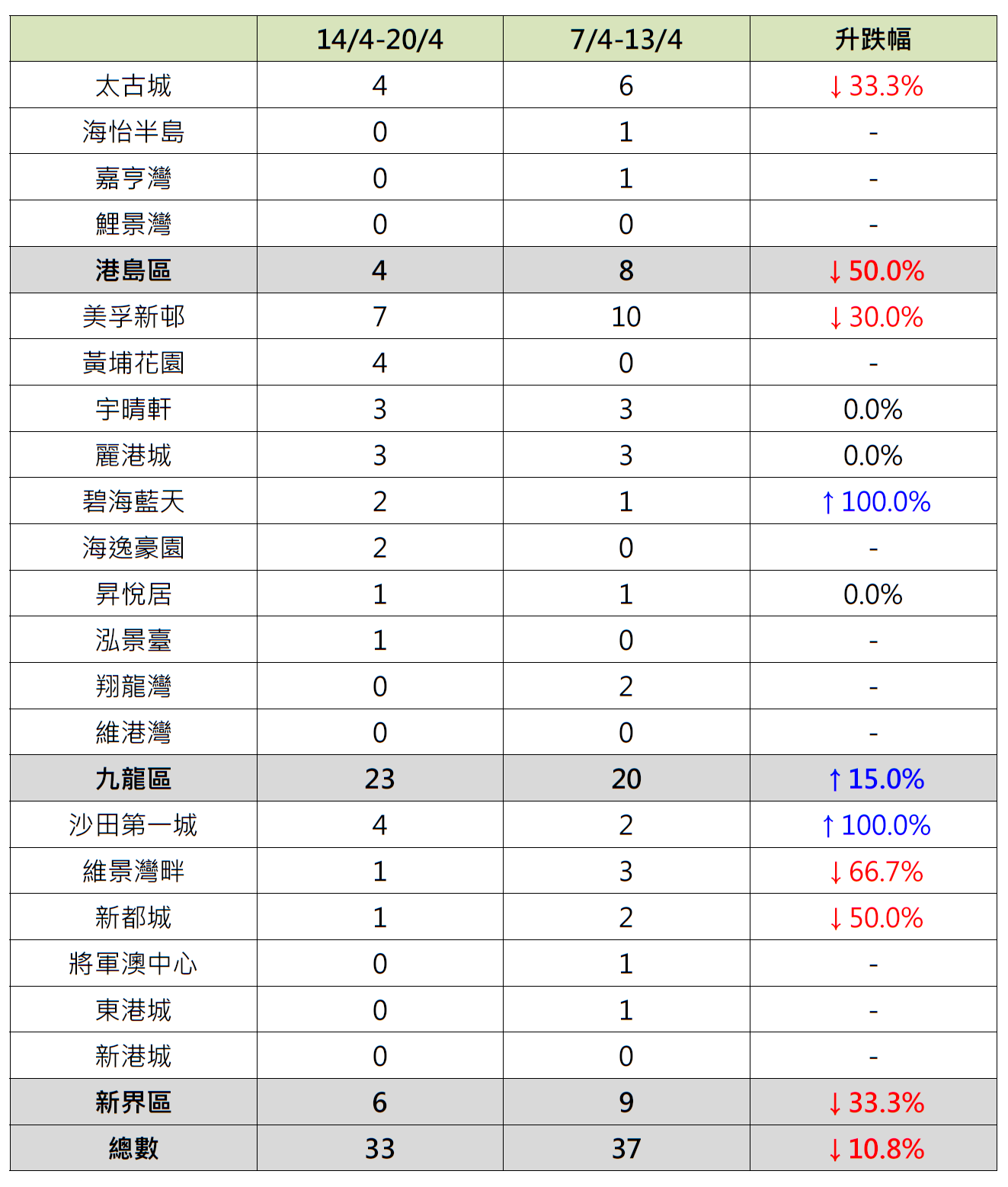 有大型全新盤準備推出市場,正在積極收票,凍結部分市場購買力,再加上上周適逢復活節長假期,不少市民外出旅遊,二手交投按周有所回落;據本行前線分行所錄得的數字顯示,綜合過去一星期(4月14日至4月20日)全港20大主要屋苑二手買賣錄33宗成交,較前周(4月7日至4月13日)的37宗減少4宗,交投稍放緩(見圖)。