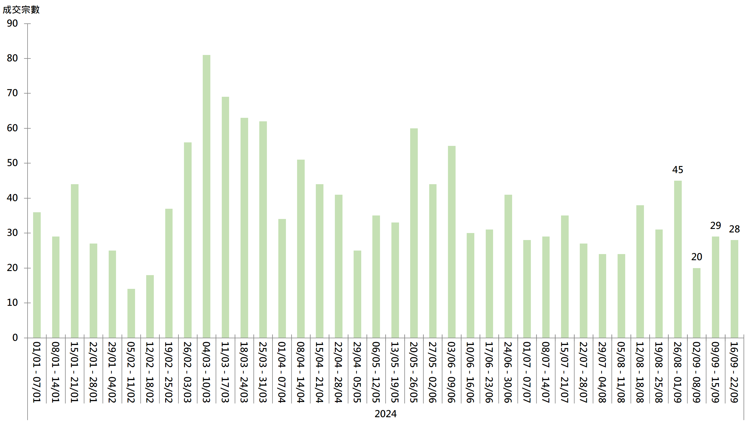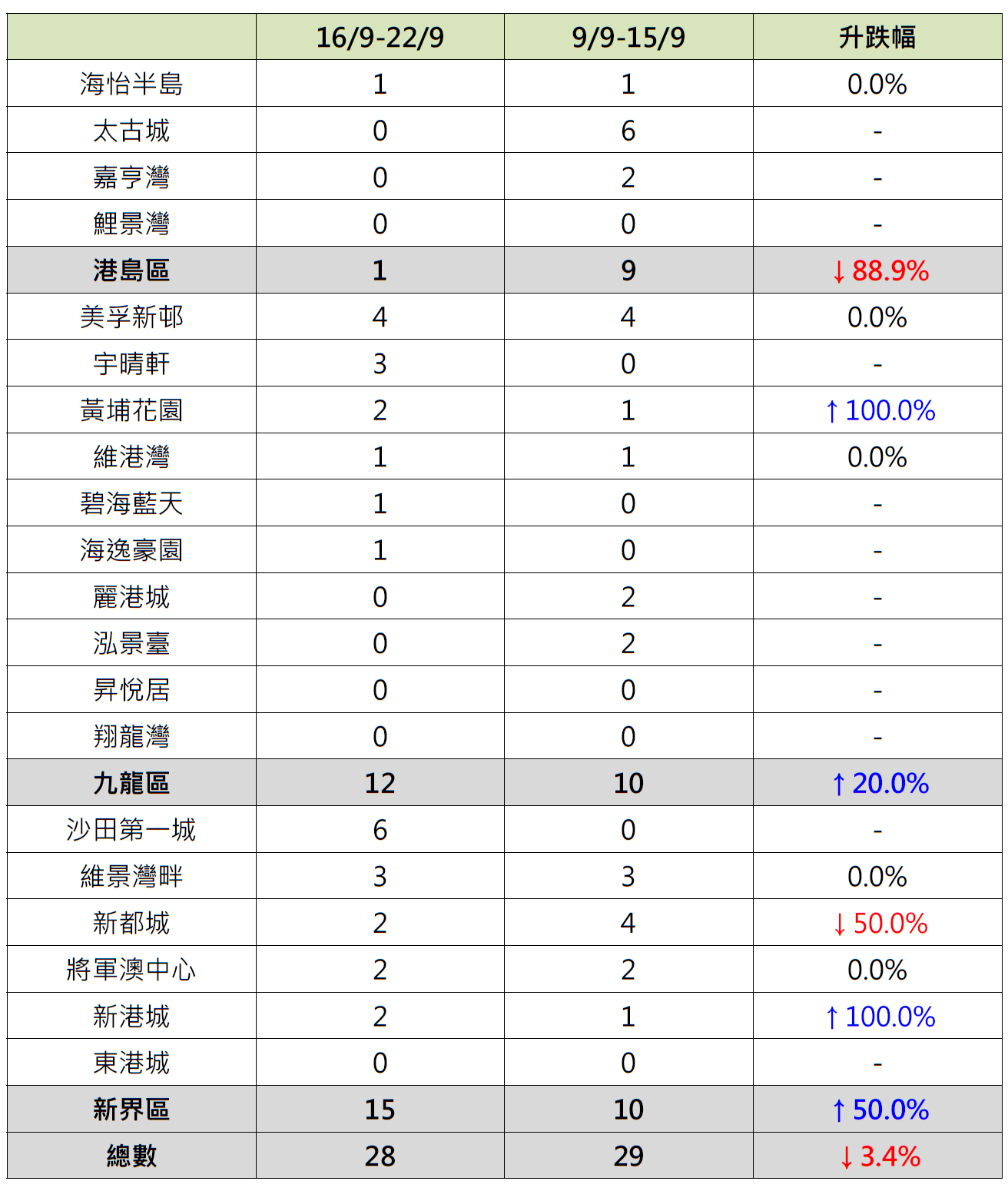本港銀行跟隨美國減息,利好樓市氣氛,雖然發展商加快推盤步伐,搶去部分市場焦點,但上周20大主要屋苑交投穩,按周僅微減1宗。據本行前線分行所錄得的數字顯示,綜合過去一星期(9月16日至9月22日)全港20大主要屋苑二手買賣錄28宗成交,較前周(9月9日至9月15日)的29宗減少1宗,或約3.4%(見圖)。