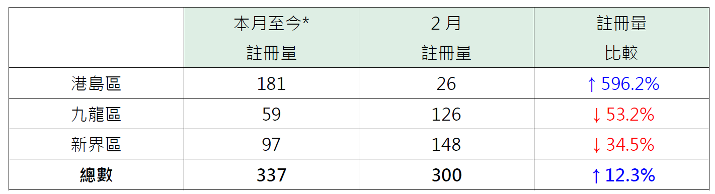 若以港島、九龍及新界三區劃分本月至今純車位註冊量表現,當中港島區錄181宗註冊,已超2月全月的26宗近6倍;註冊量大增,主要因錄得太古城逾150宗註冊,料屬拆售成交個案;相反,九龍區錄59宗註冊,仍較2月全月的126宗低約53.2%;新界區錄97宗註冊,仍較上月同期的148宗低約34.5% (見表)。