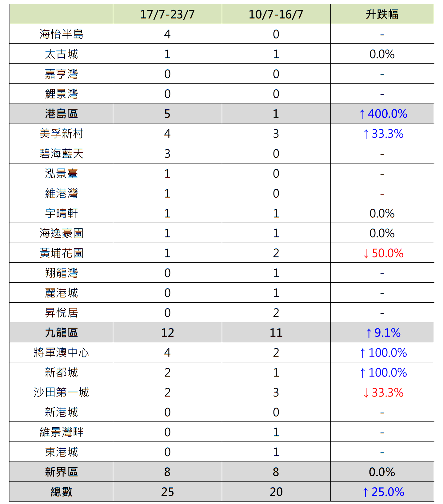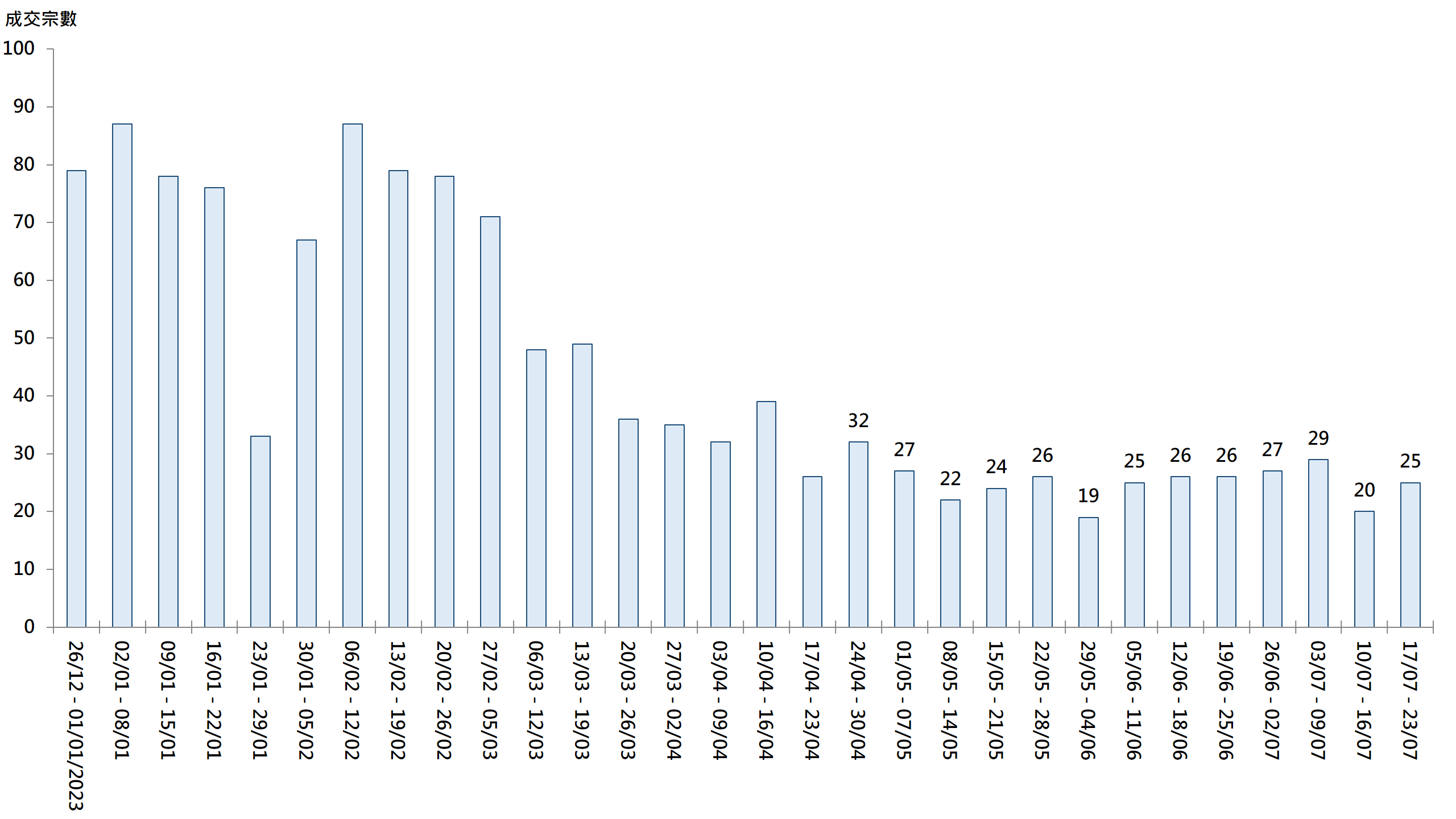 美聯儲局將於本周公佈議息結果,市場觀望氣氛濃;再加上近期新盤頻頻推售,搶去市場焦點,二手交投表現疲弱;據本行前線分行所錄得的數字顯示,綜合過去一星期(7月17日至7月23日)全港20大主要屋苑二手買賣錄25宗成交,雖較前周(7月10日至7月16日)的20宗增加25%,但仍於低位徘徊(見圖)。