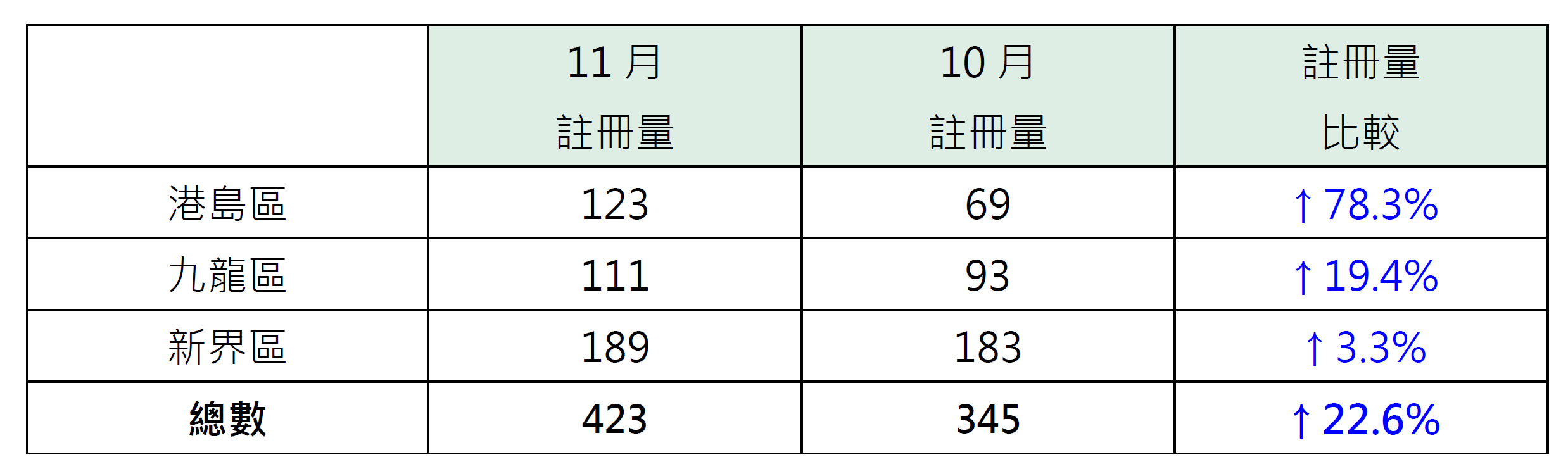 若以港島、九龍、新界三區劃分11月純車位註冊量,當中新界區錄189宗註冊,較10月的183宗增加約3.3%;九龍區錄111宗註冊,較10月的93宗增加約19.4%;港島區錄123宗註冊,較10月的69宗增加約78.3%;區內純車位註冊量按月大增,主要因期內錄得黃竹坑揚海拆售個案註冊登記,推升港島區11月純車位註冊量(見表)。