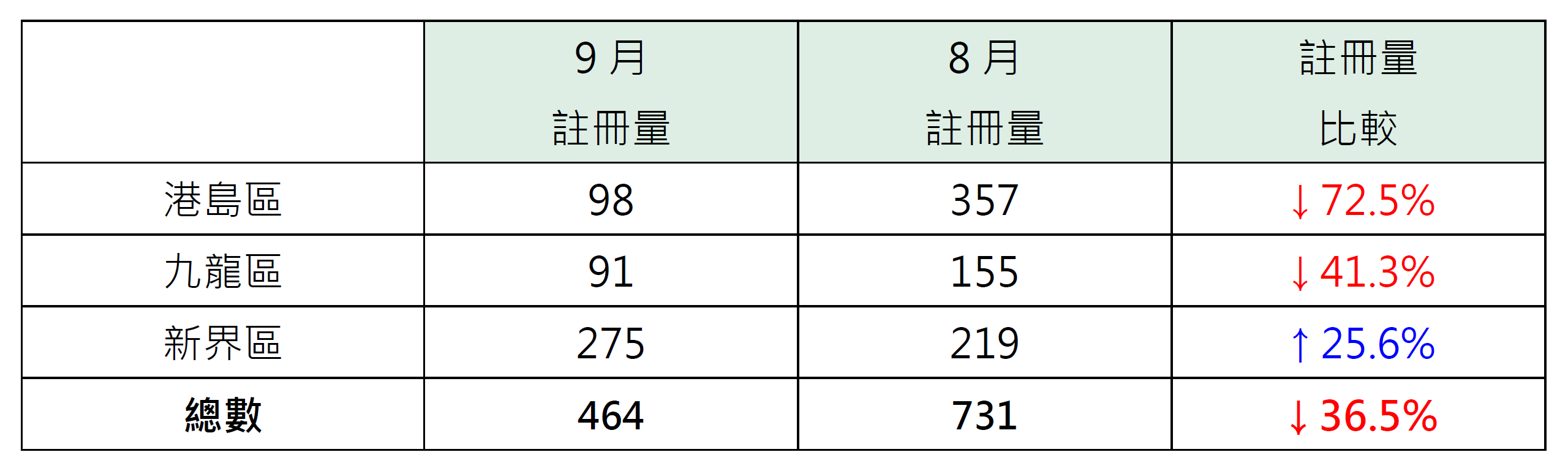 若以三區劃分9月純車位註冊量,其中港島區錄98宗註冊,較8月的357宗減少約72.5%,註冊量按月跌幅顯著,主要因8月錄不少太古城拆售車位登記,推升區內8月註冊量;九龍區錄91宗註冊,較8月的155宗減少約41.3%;相反,新界區錄275宗註冊,較8月的219宗增加約25.6%(見表)。