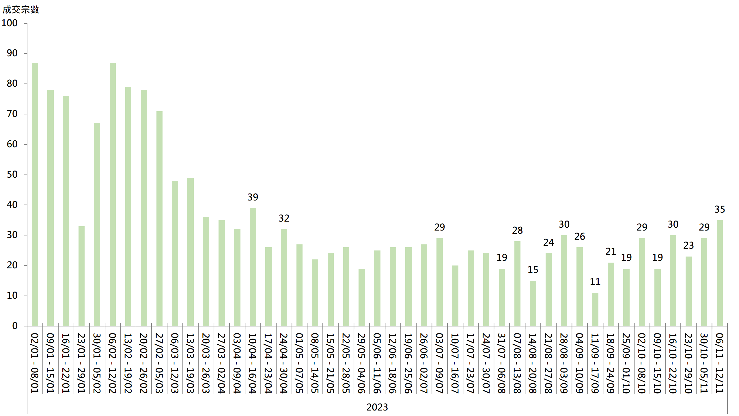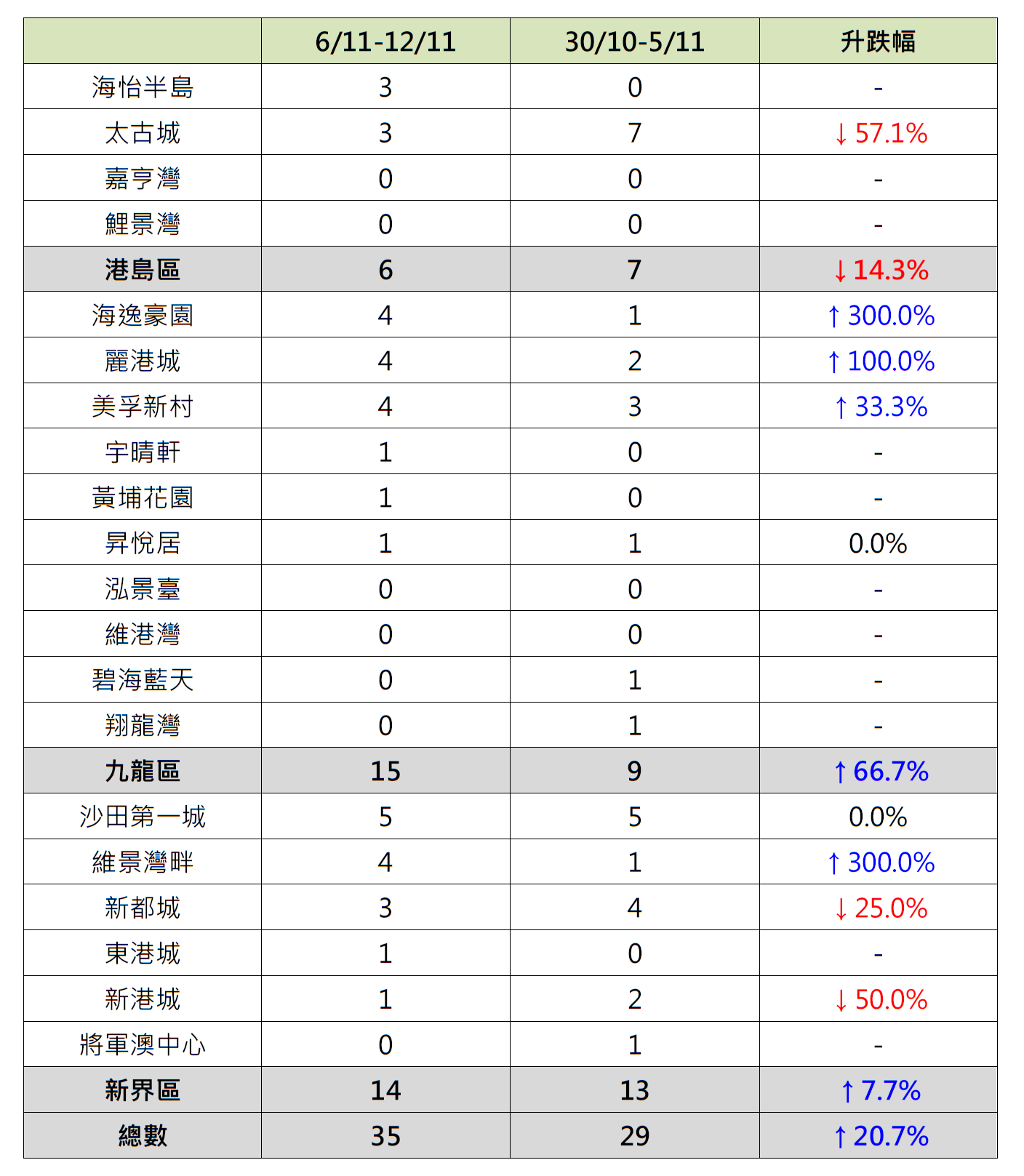 據本行前線分行所錄得的數字顯示,綜合過去一星期(11月6日至11月12日)全港20大主要屋苑二手買賣錄35宗成交,較前周(10月30日至11月5日)的29宗增加6宗,或約20.7%(見圖)。