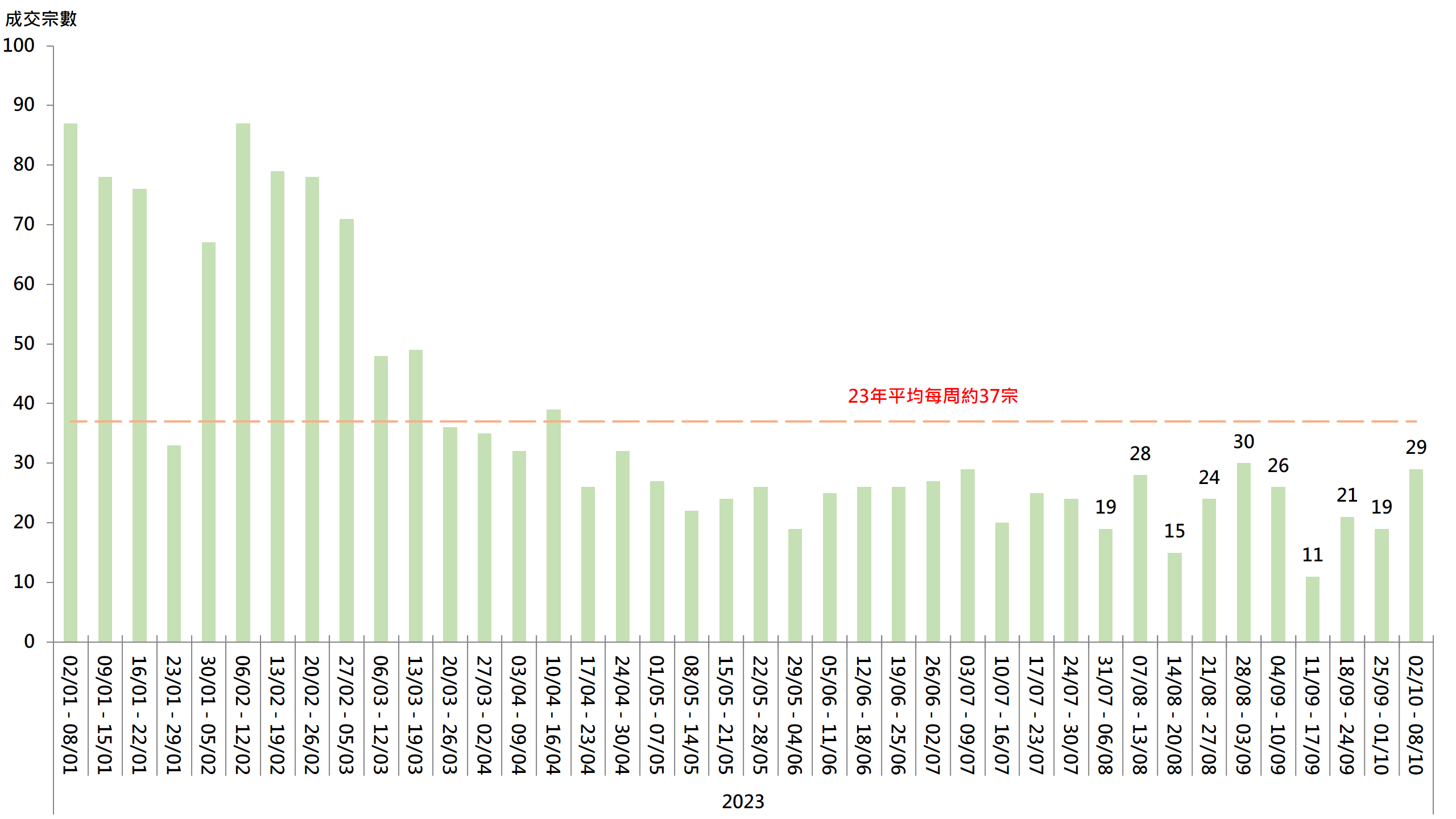 圖︰20大屋苑每周二手買賣成交宗數走勢