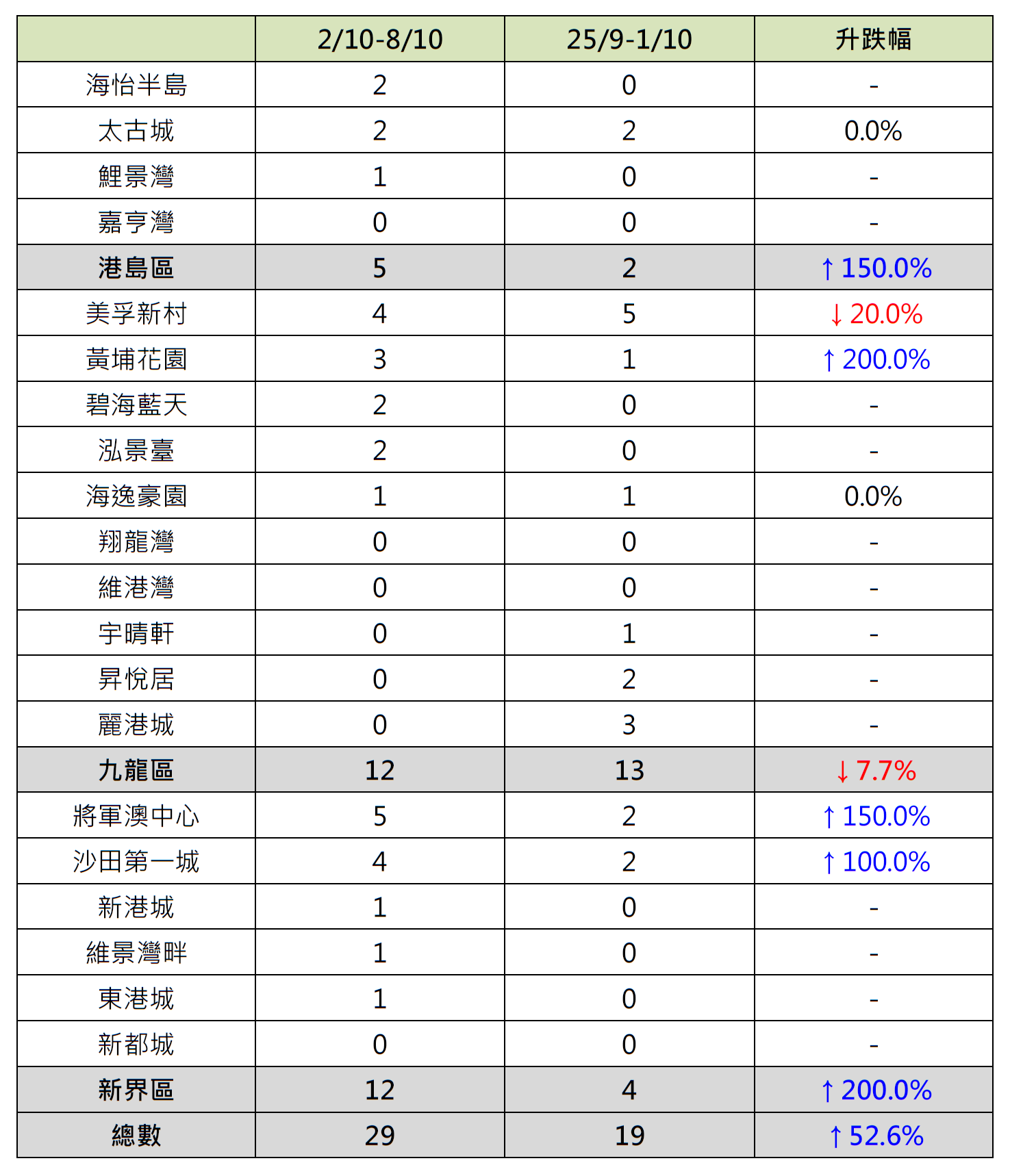 反觀,九龍區10個指標屋苑上周錄12宗成交,按周減少約7.7%;當中美孚新村錄4宗成交,按周減少20%;宇晴軒由前周錄1宗成交減少至上周「零成交」;昇悅居由前周錄2宗成交減少至上周「零成交」;麗港城更由前周錄3宗成交減少至上周「零成交」;相反,黃埔花園錄3宗成交,按周增加2倍;碧海藍天及泓景臺齊「破蛋」,按周同樣增加2宗成交。