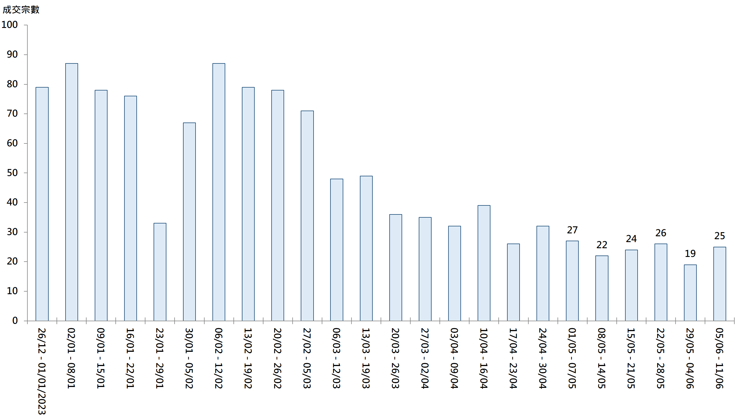據本行前線分行所錄得的數字顯示,綜合過去一星期(6月5日至6月11日)全港20大主要屋苑二手買賣錄25宗成交,較前周(5月29日至6月4日)的19宗增加約31.6%(見圖)。