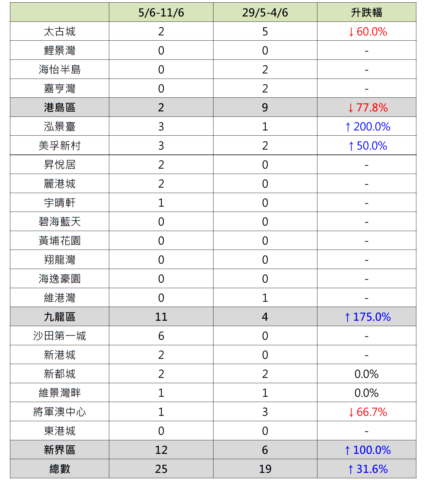 反觀,港島區4個指標屋苑上周錄2宗成交,按周減少約77.8%;當中太古城錄2宗成交,按周減少60%;海怡半島及嘉亨灣齊由前周錄2宗成交減少至上周「零成交」。