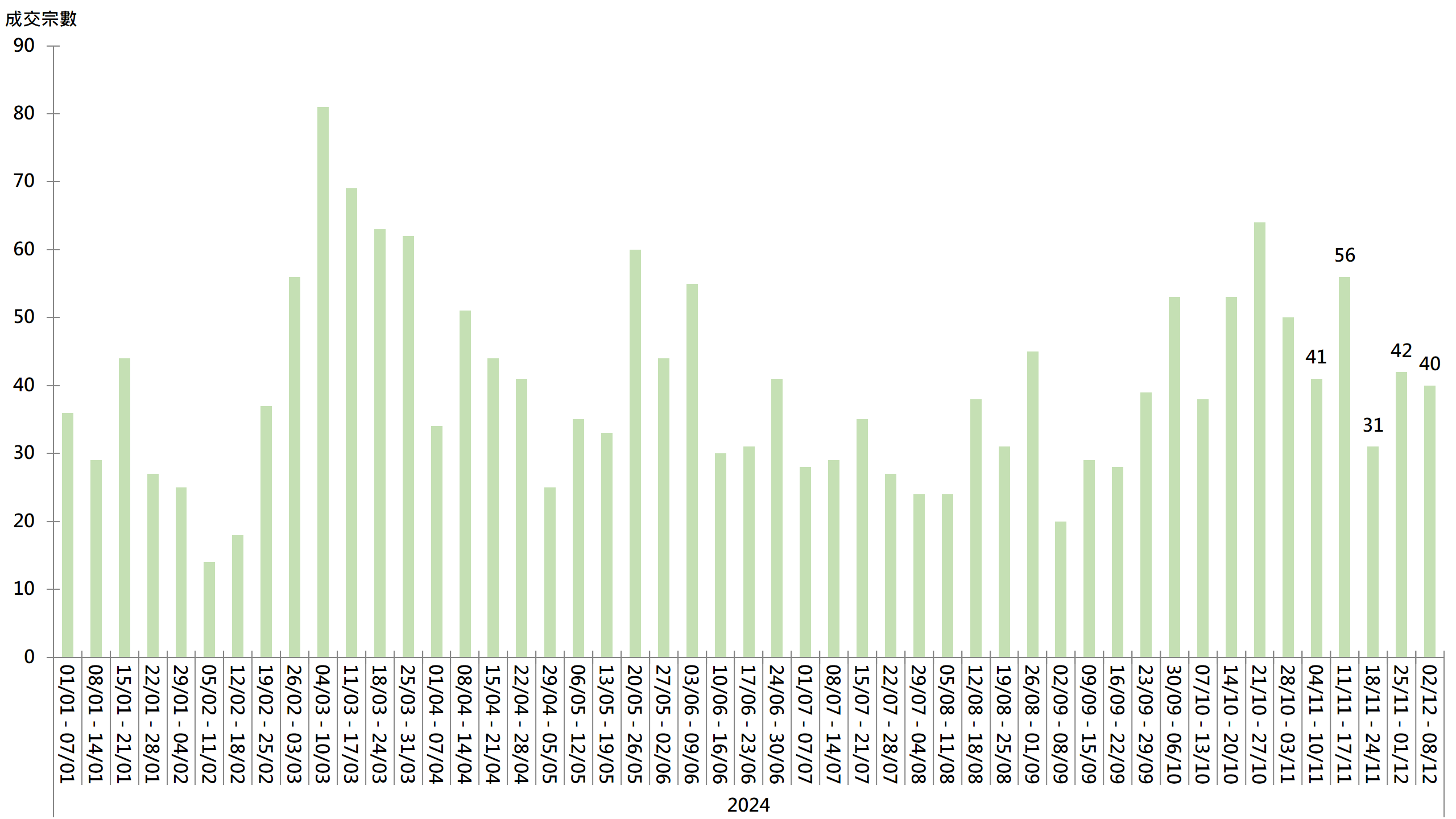 據本行前線分行所錄得的數字顯示,綜合過去一星期(12月2日至12月8日)全港20大主要屋苑二手買賣錄40宗成交,較前周(11月25日至12月1日)的42宗僅減少2宗,或約4.8%,仍企穩40宗水平(見圖)。