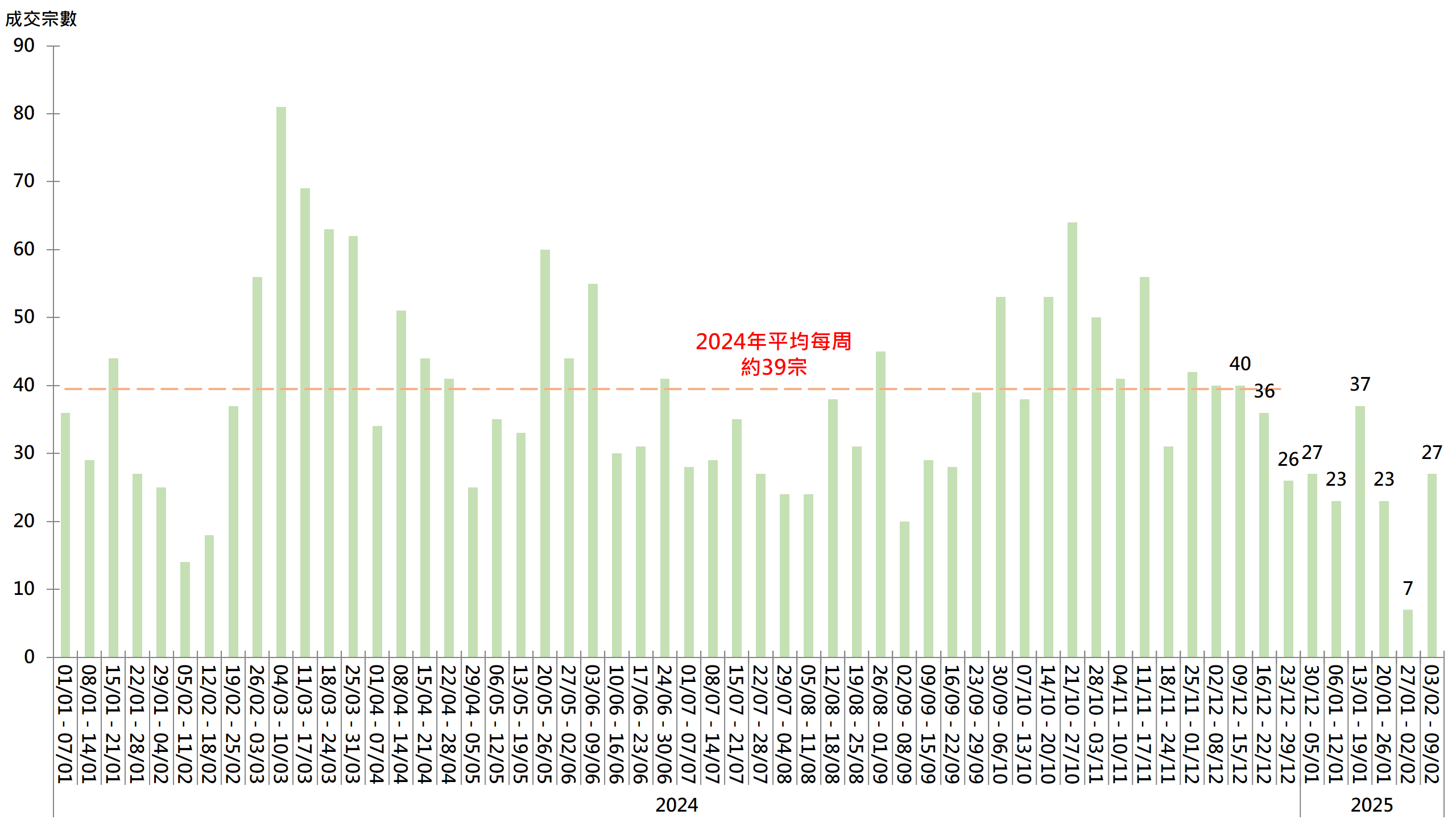 據本行前線分行所錄得的數字顯示,綜合過去一星期(2月3日至2月9日)全港20大主要屋苑二手買賣錄27宗成交,較前周(1月27日至2月2日)的7宗大升逾2.8倍。升幅顯著主要因前周適逢新春長假,交投「基數低」所致。隨著節日氣氛減退,上周交投亦見回升;然而,若與2024年平均每周約39宗成交相比,上周成交仍屬較低水平(見圖)。