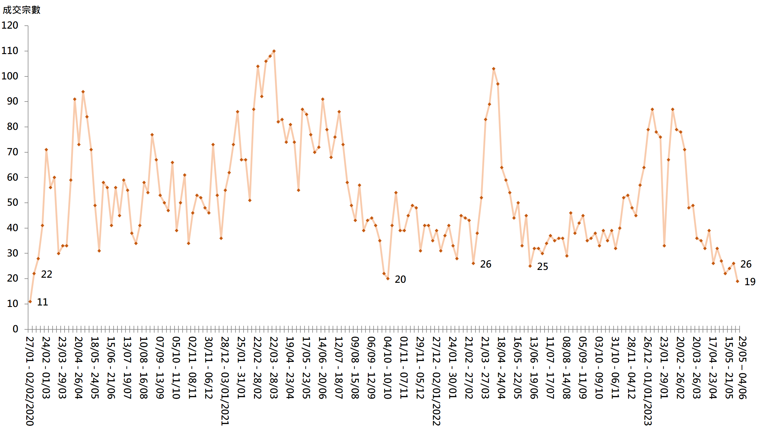 圖︰20大屋苑每周二手買賣成交宗數走勢