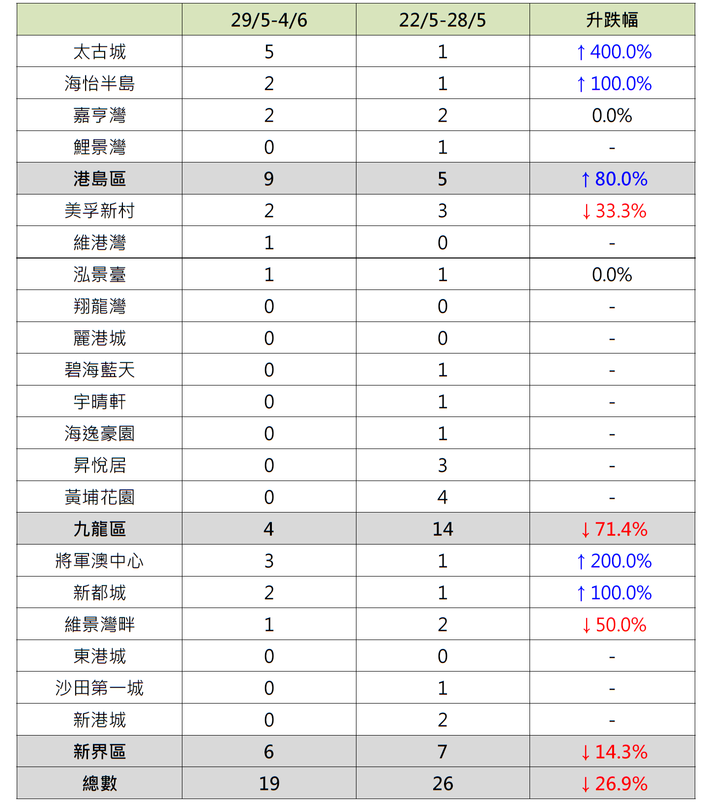 觀乎上周港島、九龍及新界三區屋苑二手交投表現,其中九龍區10個指標屋苑上周錄4宗成交,按周減少約71.4%;當中美孚新村錄2宗成交,按周減少約33.3%;碧海藍天、宇晴軒及海逸豪園齊由前周錄1宗成交減少至上周「零成交」;昇悅居由前周錄3宗成交減少至上周「零成交」;黃埔花園由前周錄4宗成交減少至上周「零成交」;相反,維港灣「破蛋」,按周增加1宗成交。